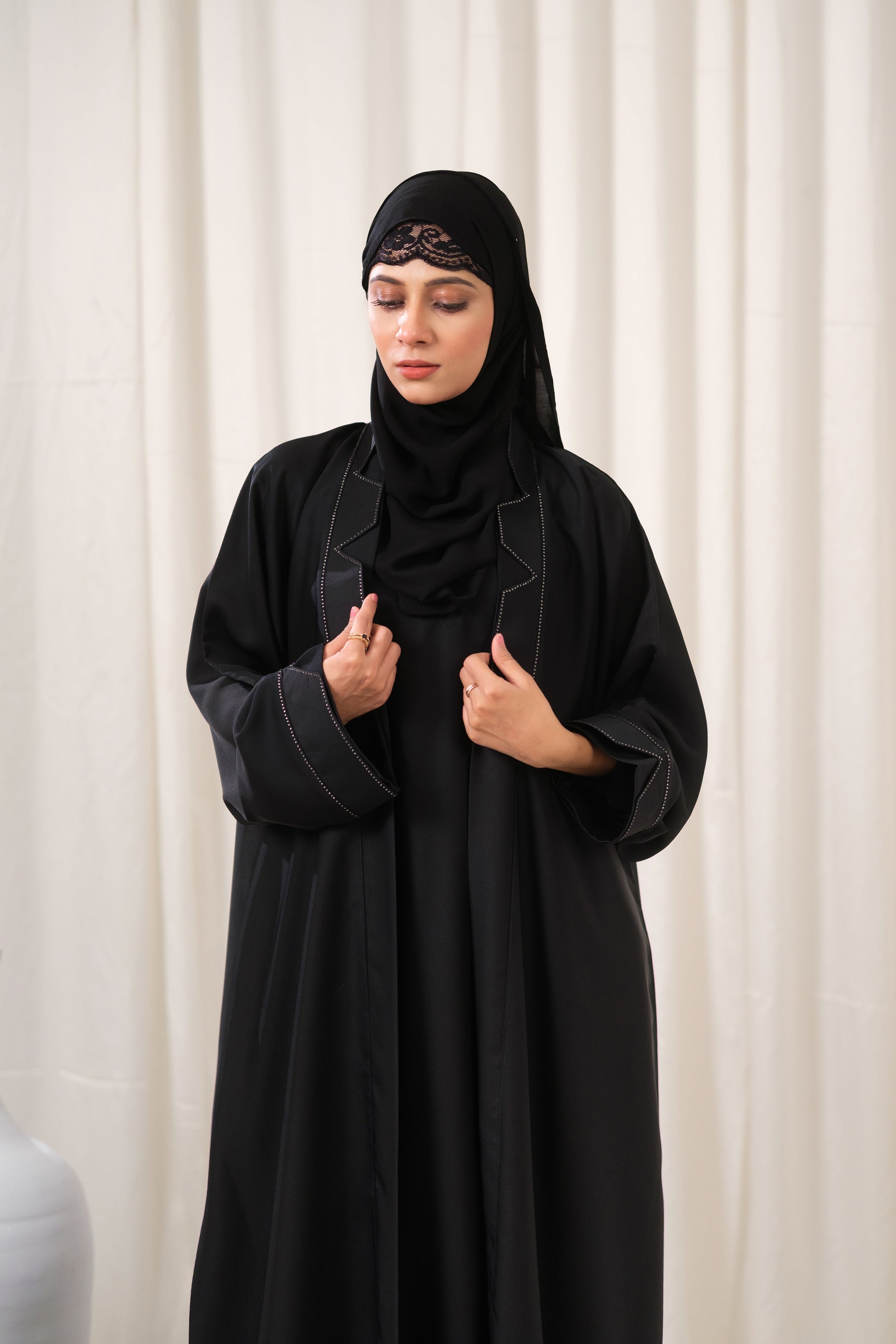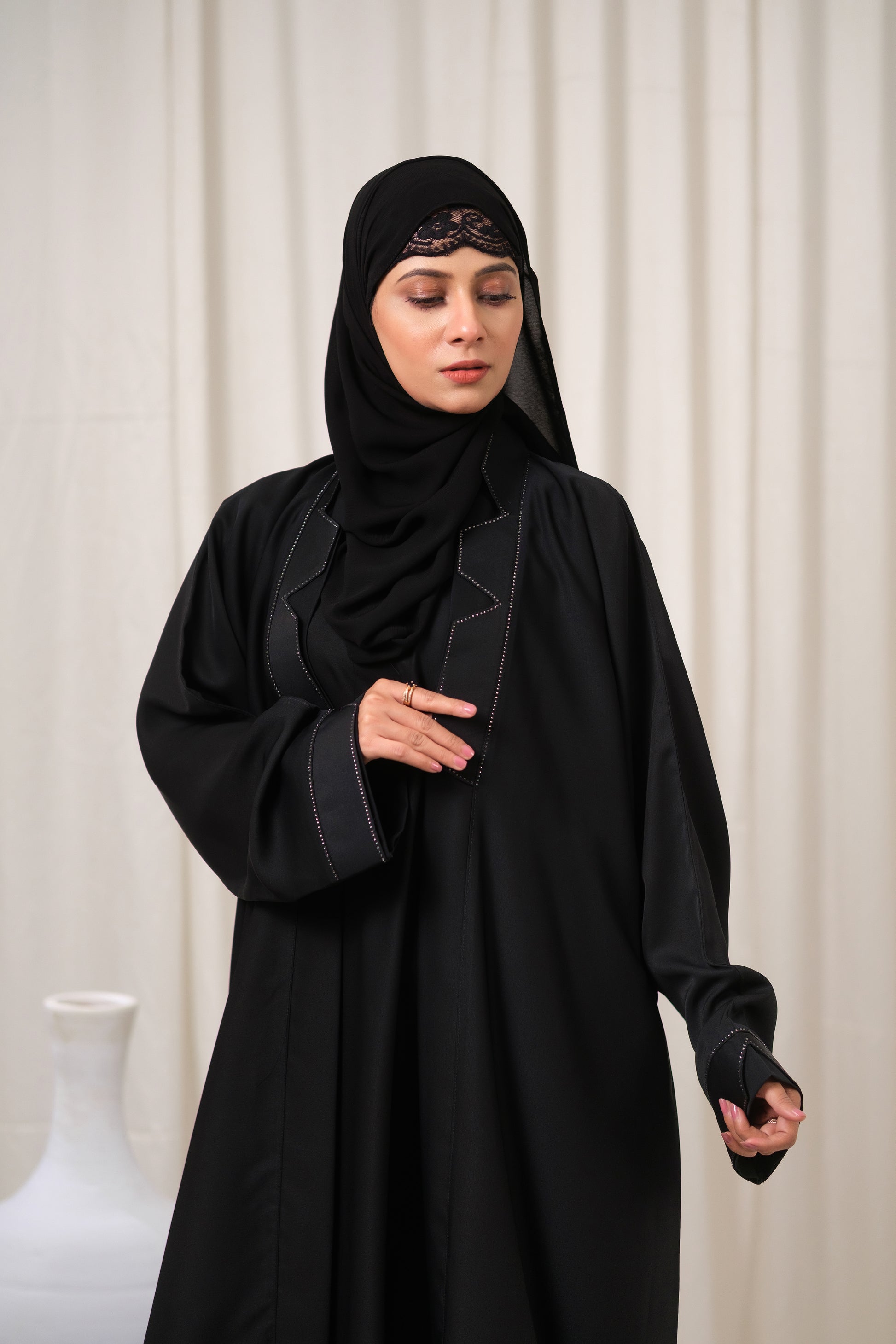 The Apex Edge Abaya, the ultimate statement piece defined by its sharp tailoring and subtle, dark detailing. Crafted from luxurious Imported Nidha Fabric in timeless Classic Black, this front-open abaya is structured with a sophisticated tailored lapel/collar and clean lines. The name highlights its apex (high-end) silhouette and edge (defined structure). The look is perfected by subtle vertical lines of crystals that elegantly trace the edges of the lapel and the cuffs, adding a refined, sophisticated shimmer that blends beautifully into the black fabric.