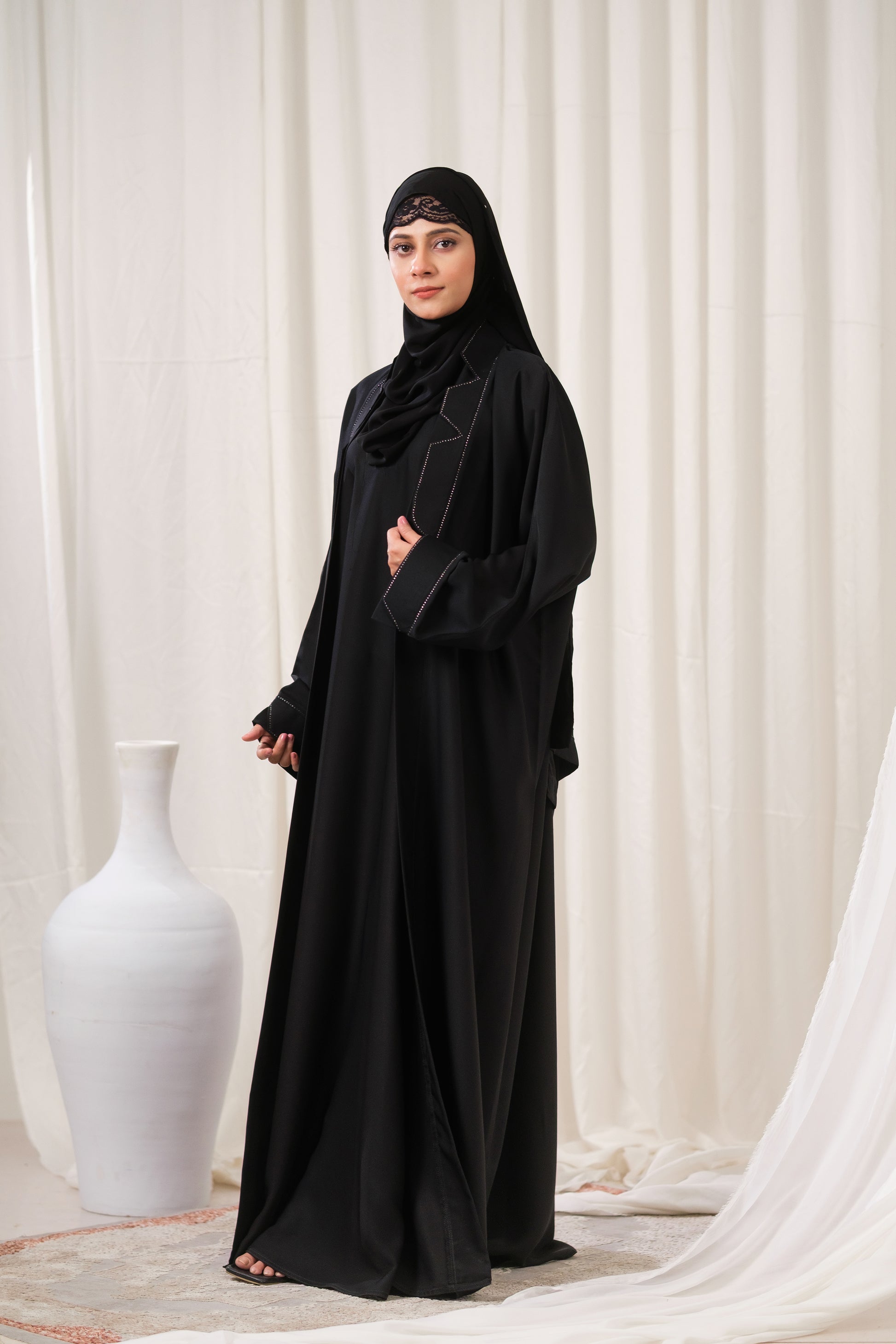 The Apex Edge Abaya: Peak Sophistication in Black with Tailored Lapel and Crystals