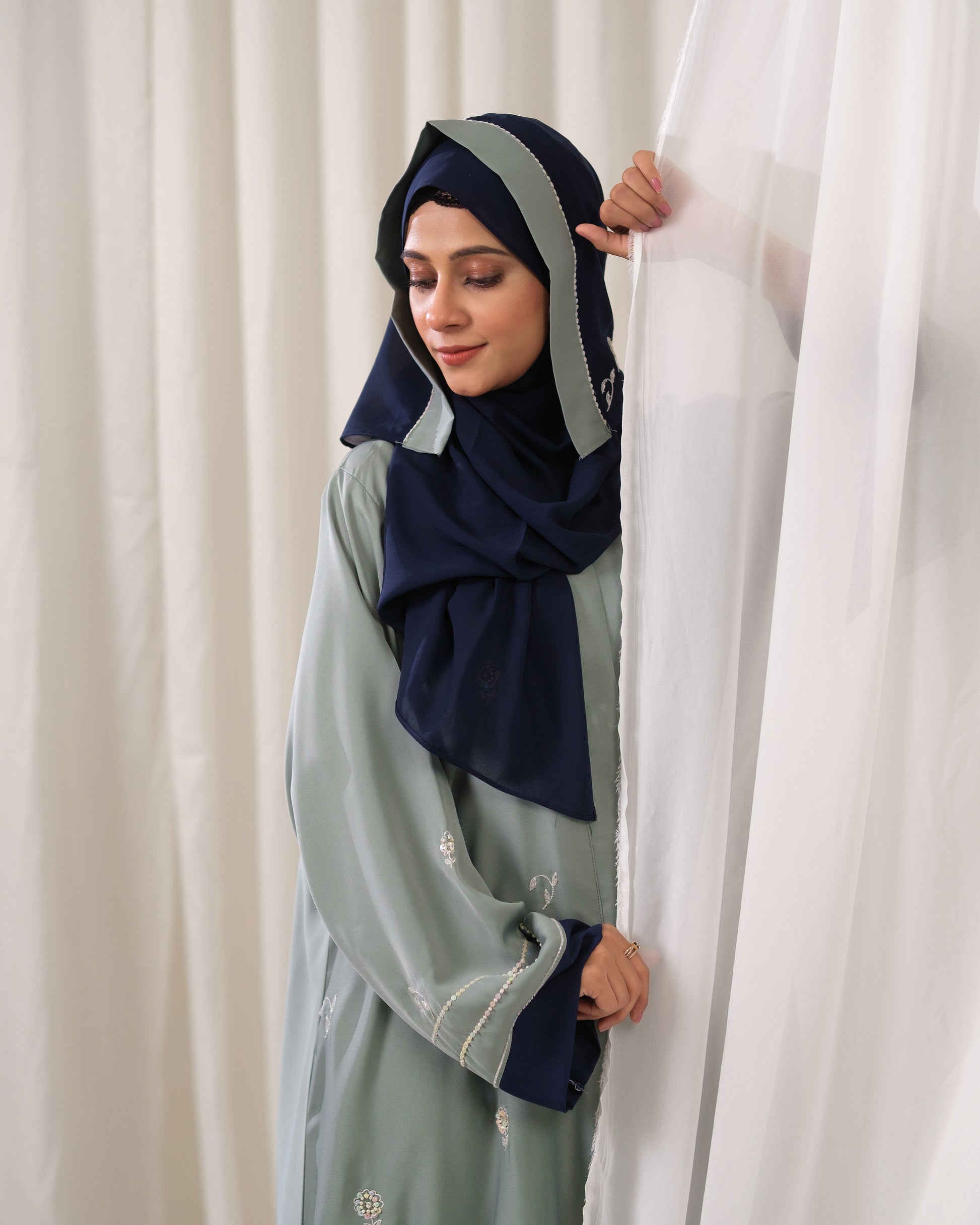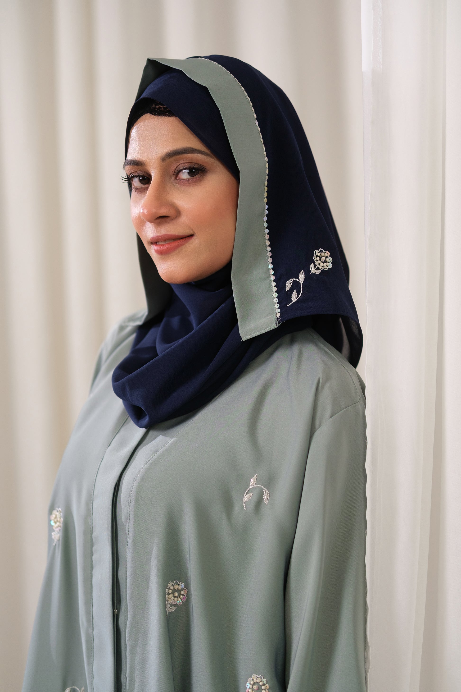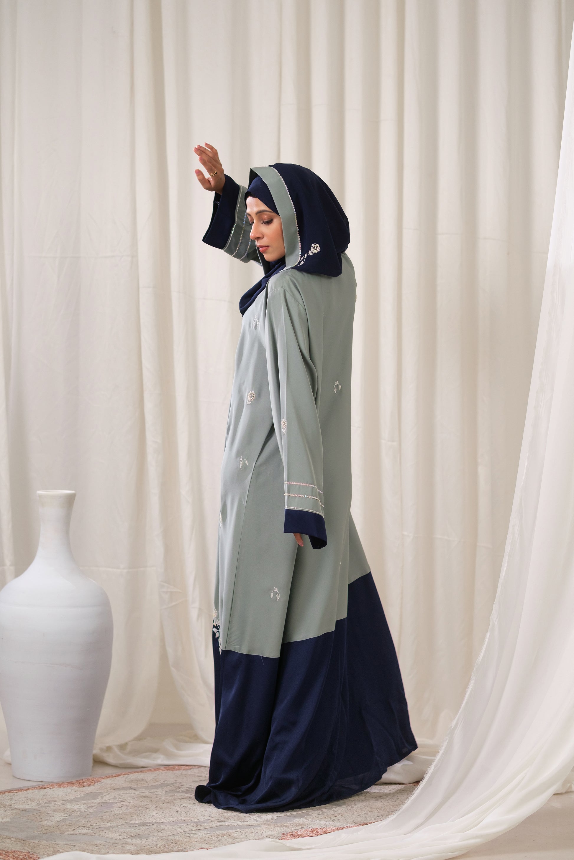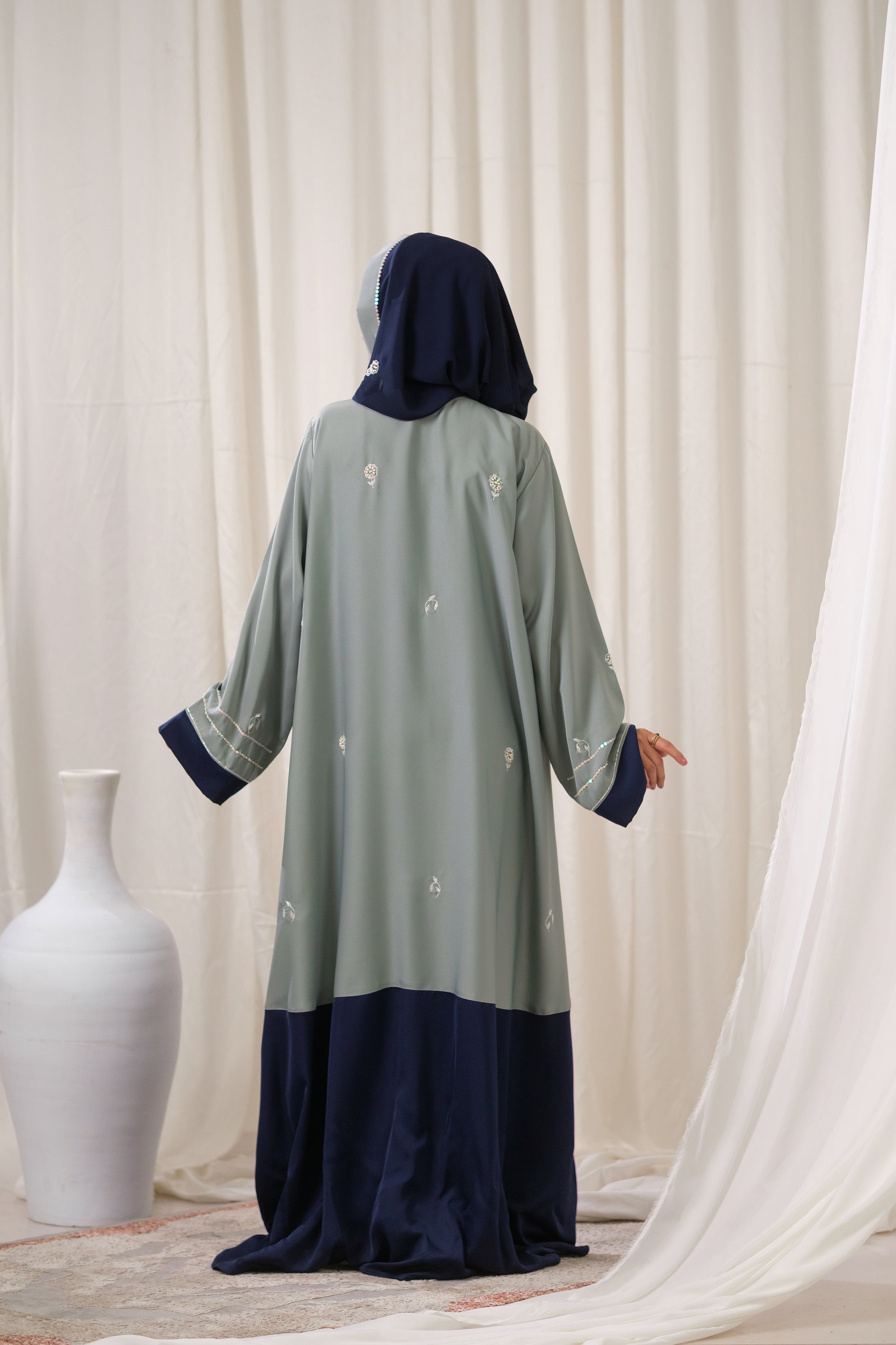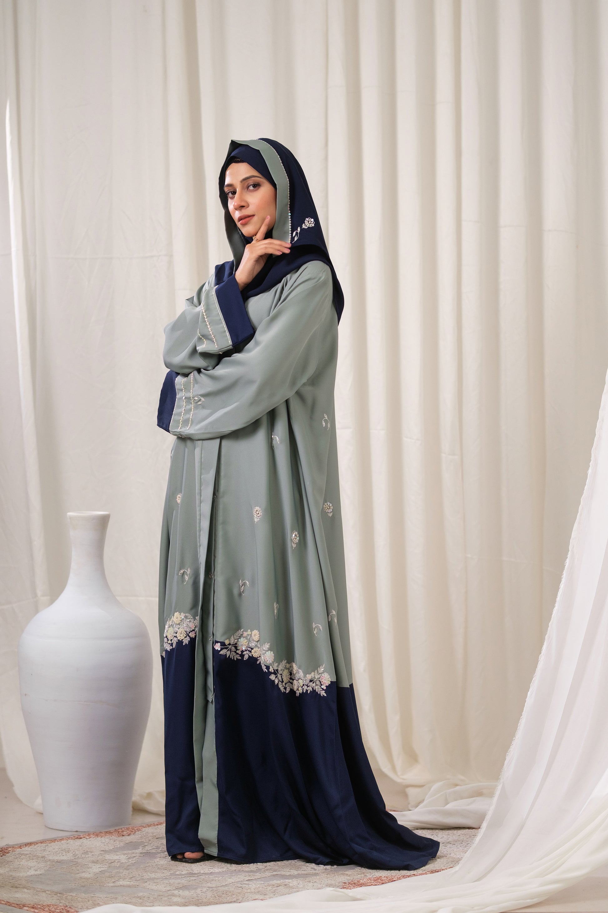 We designed The Artisan Weave Abaya for the discerning client who values craftsmanship and subtle luxury. The color blocking creates a tailored, architectural silhouette, while the delicate floral embroidery adds a refined, feminine touch. This piece offers the perfect balance between the timeless elegance of Navy and the modern sophistication of Sage Green.