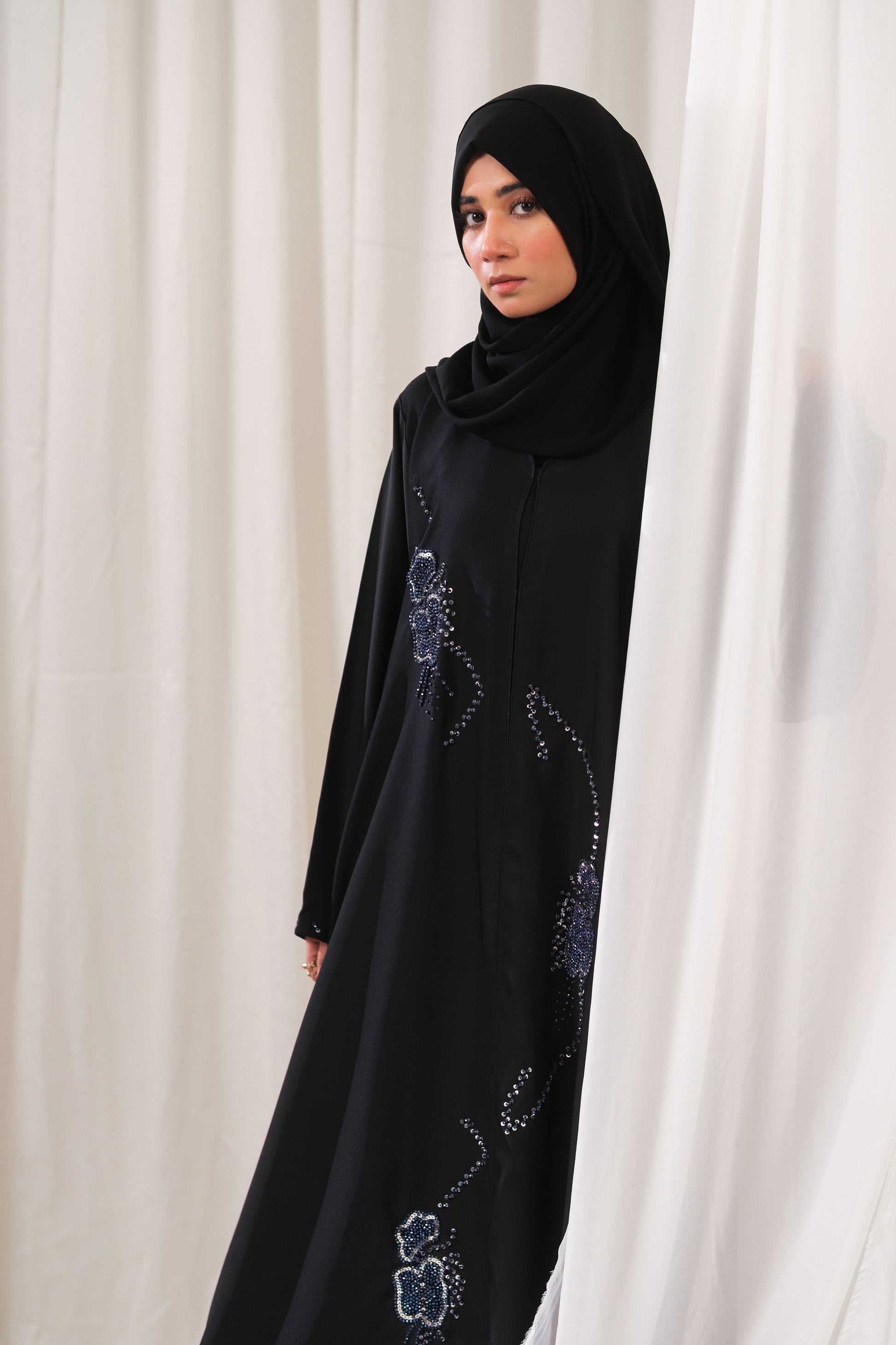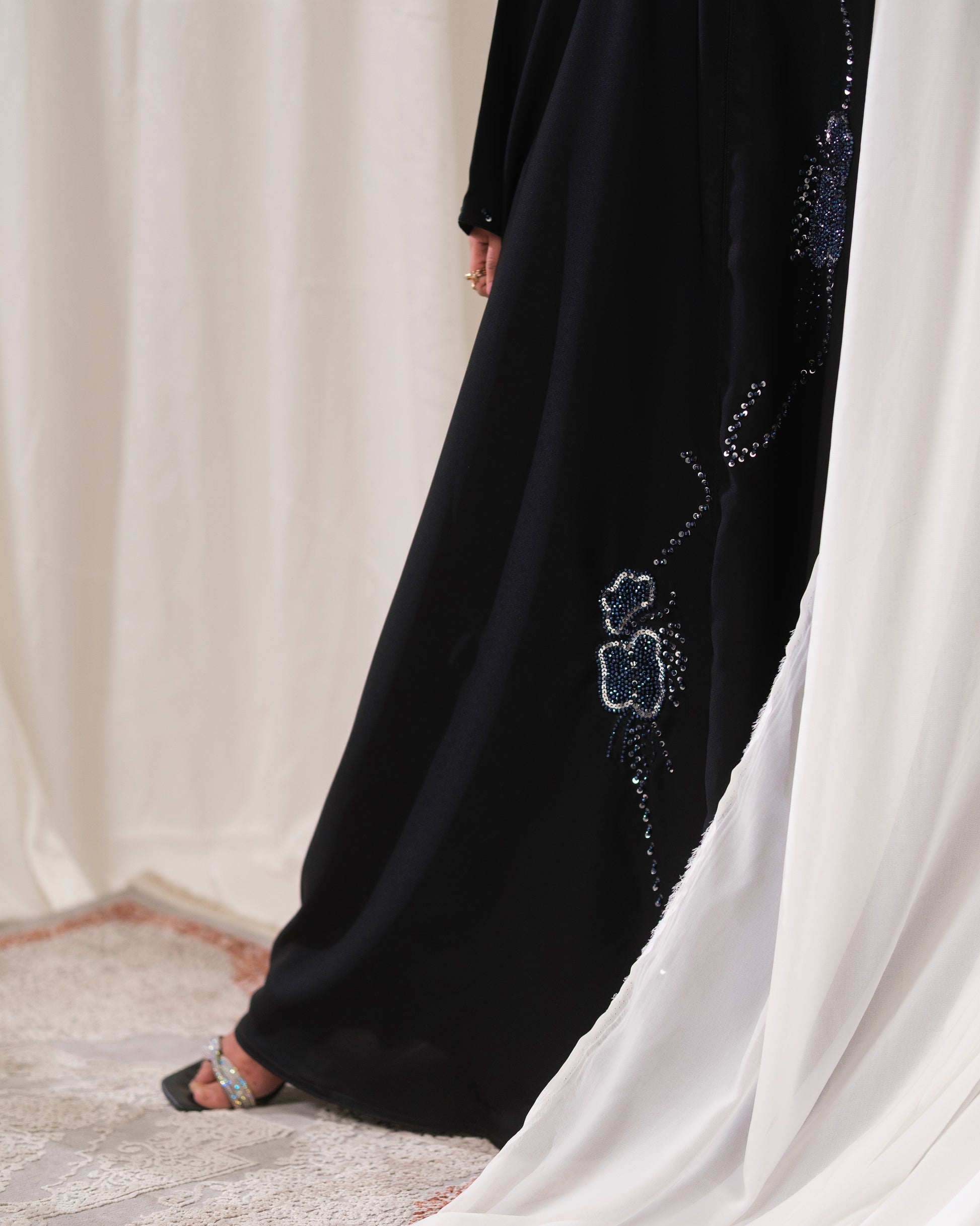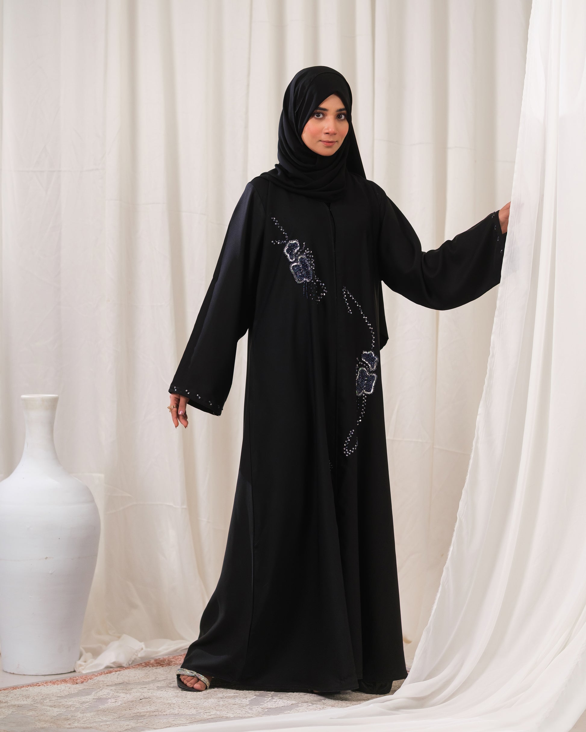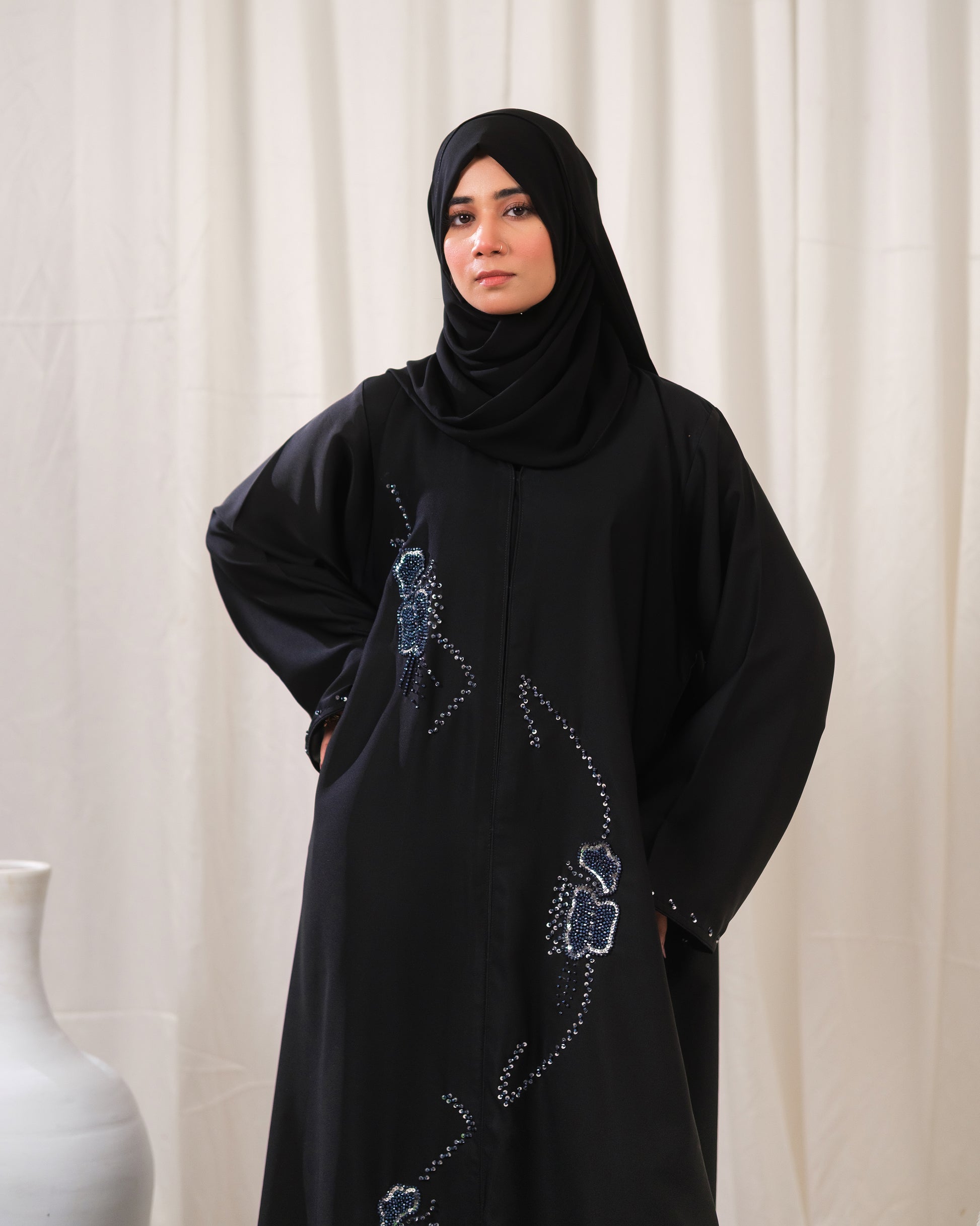 The Cosmic Trail Abaya, a luxurious fusion of classic color and shimmering artistry. Crafted from high-quality Nidha Fabric, this deep black abaya features an intricate design of floral motifs and winding vines rendered in dazzling blue and silver beads/crystals. This vertical, trailing embellishment adds striking elegance and a lengthening visual effect, like stardust drifting down the front.
