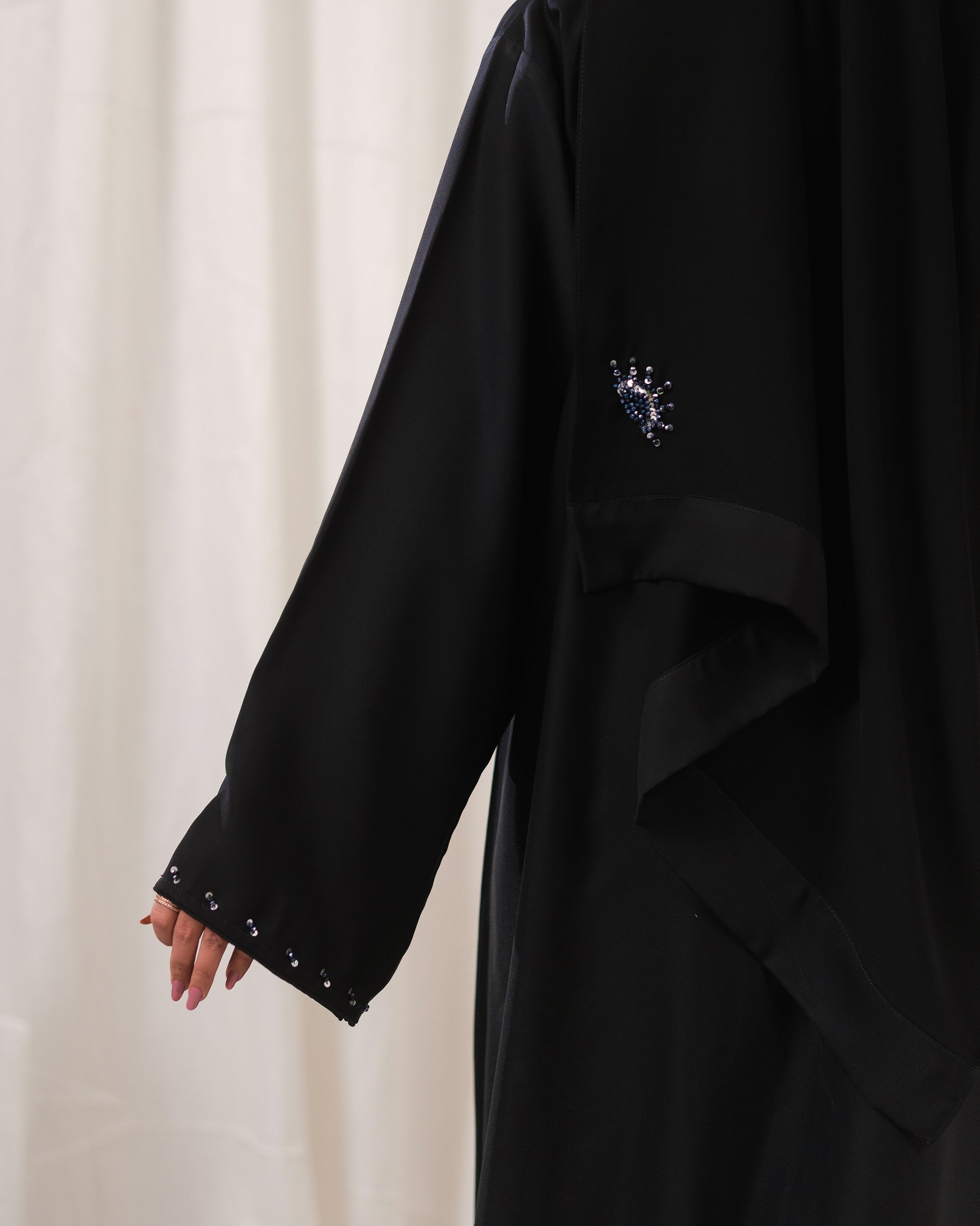 | Q: Is this abaya front-open or closed? | A: This is a front-open abaya, providing versatile layering and styling. |
