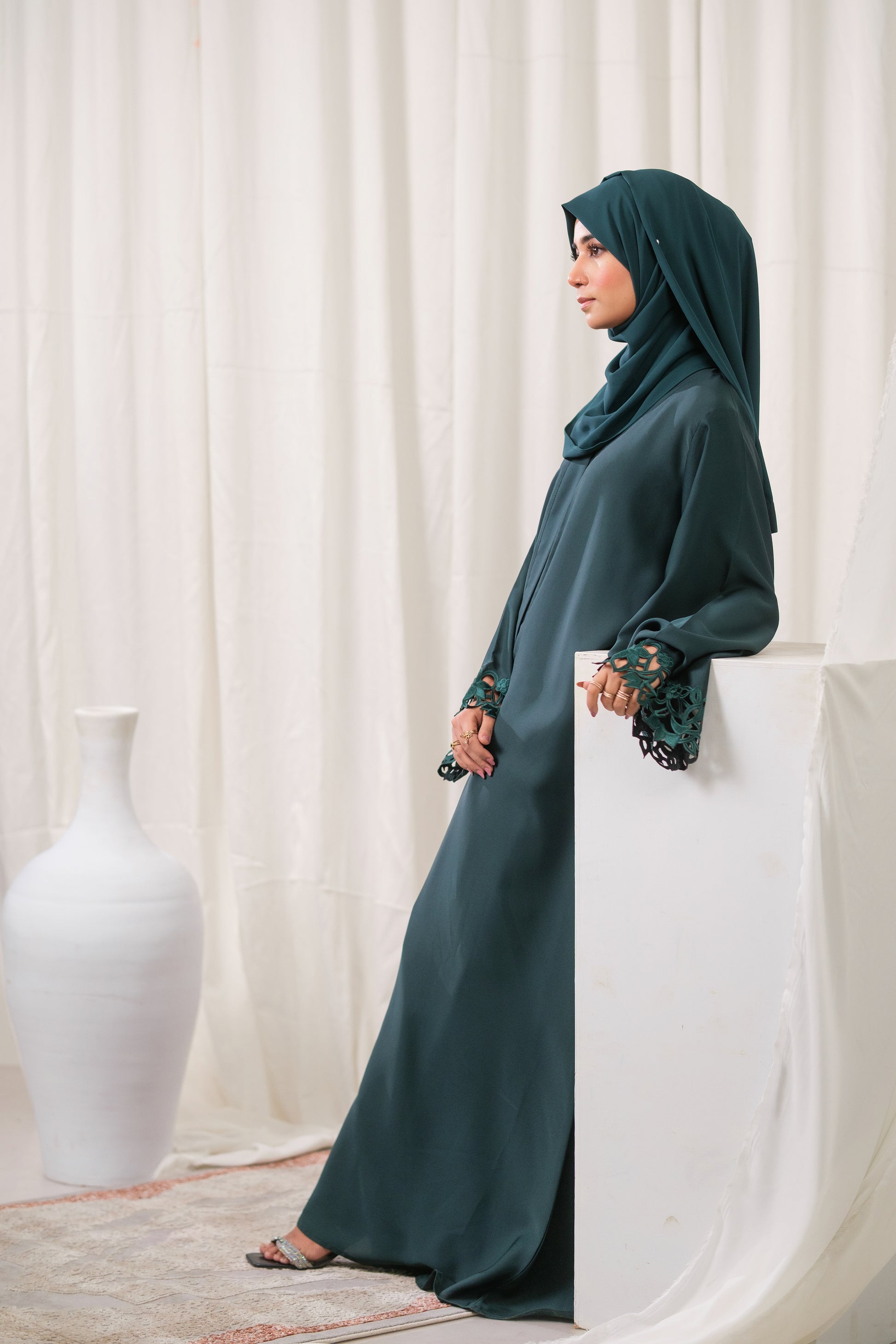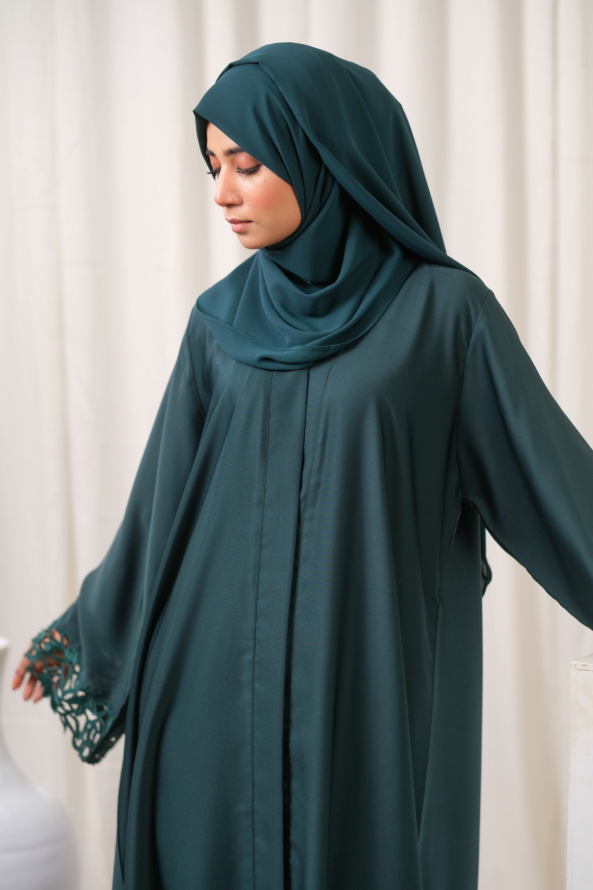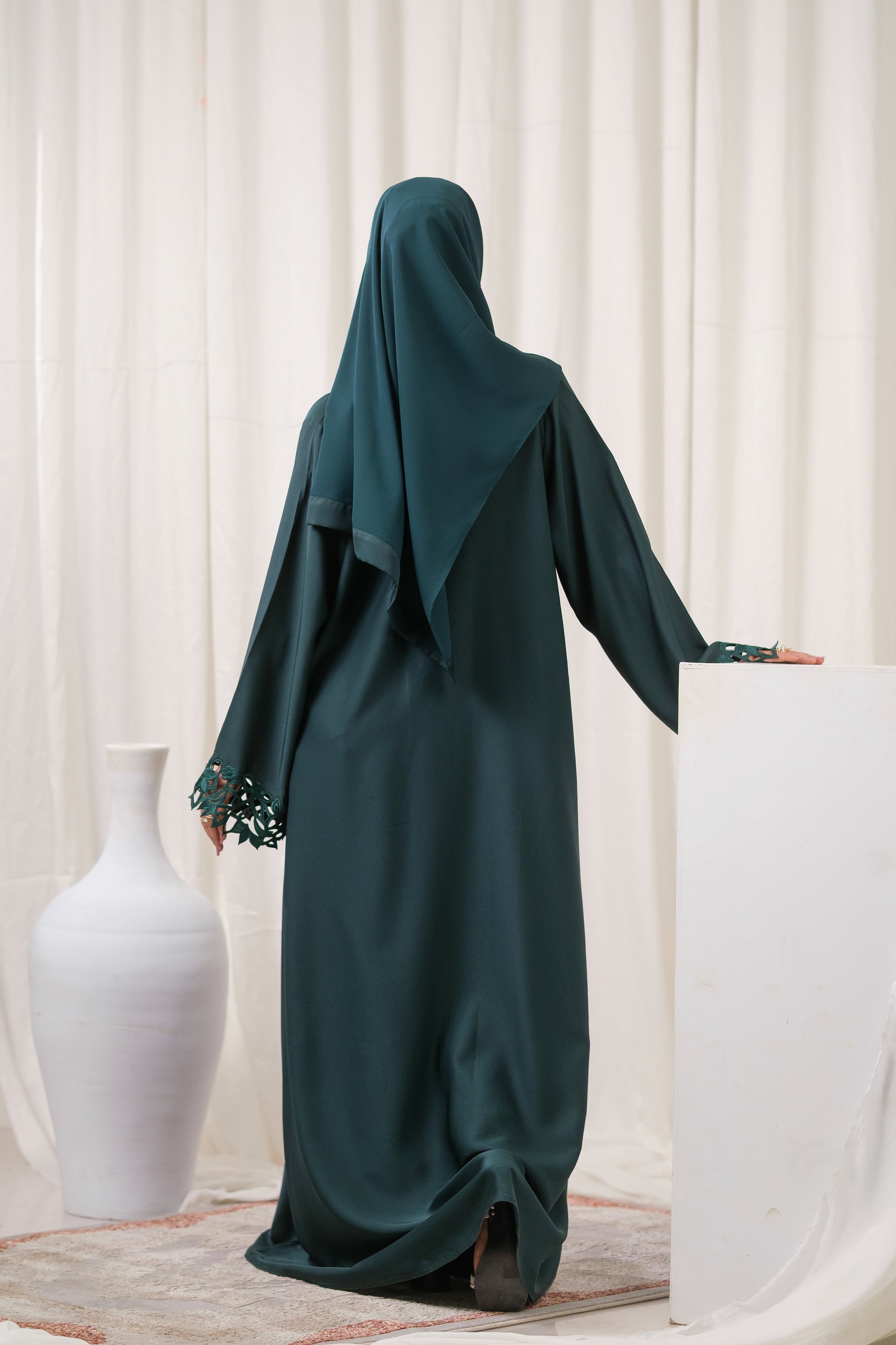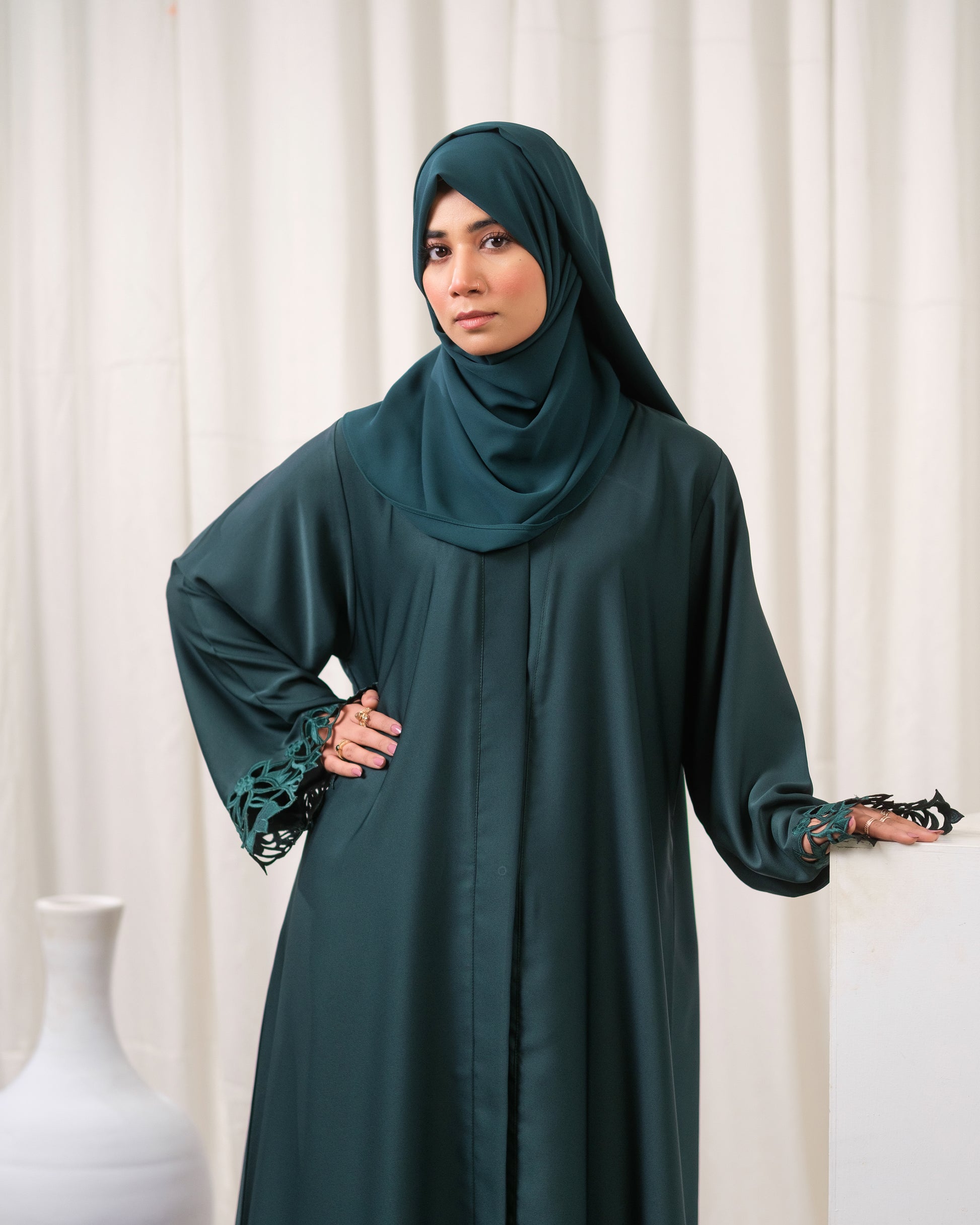 We Stand By Our Craftsmanship. Every abaya is rigorously inspected, guaranteeing the laser-cut detailing is clean and precise, and the fabric maintains its rich emerald color. Expect a pristine garment with lasting color and construction.