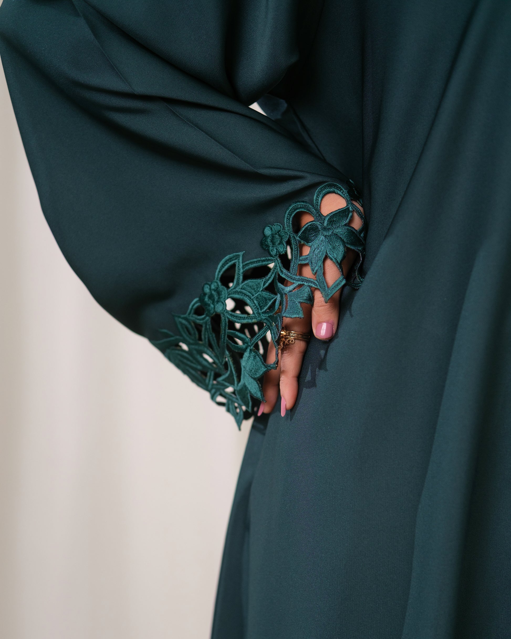 We designed The Emerald Cut for the woman who appreciates subtle drama and textural contrast. Inspired by lush botanicals and luxurious jewel tones, this abaya is built to make a refined statement. The clean lines and beautiful drape allow the exquisite cuff work—the main feature—to shine, offering a perfect balance between everyday modesty and event-ready sophistication.