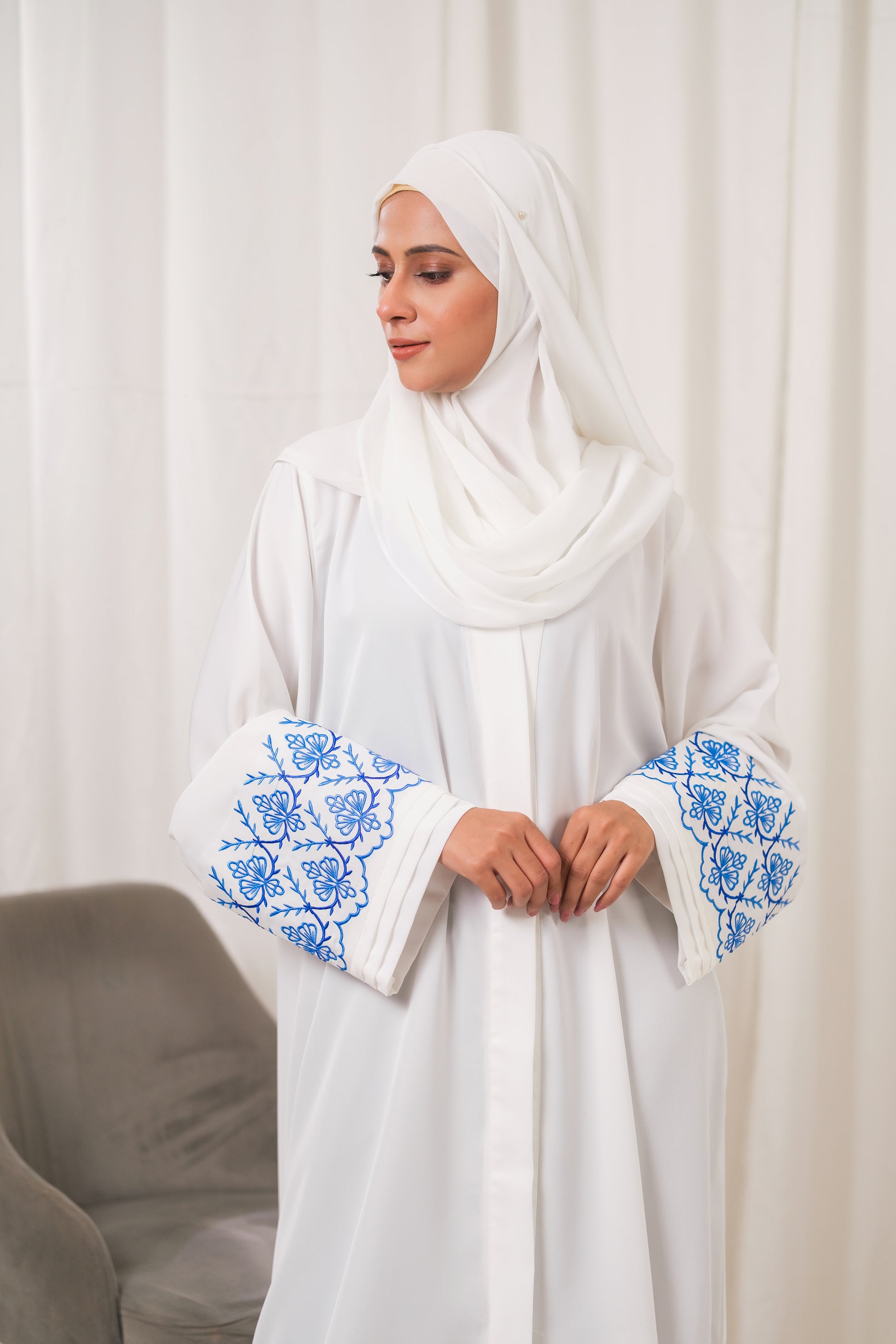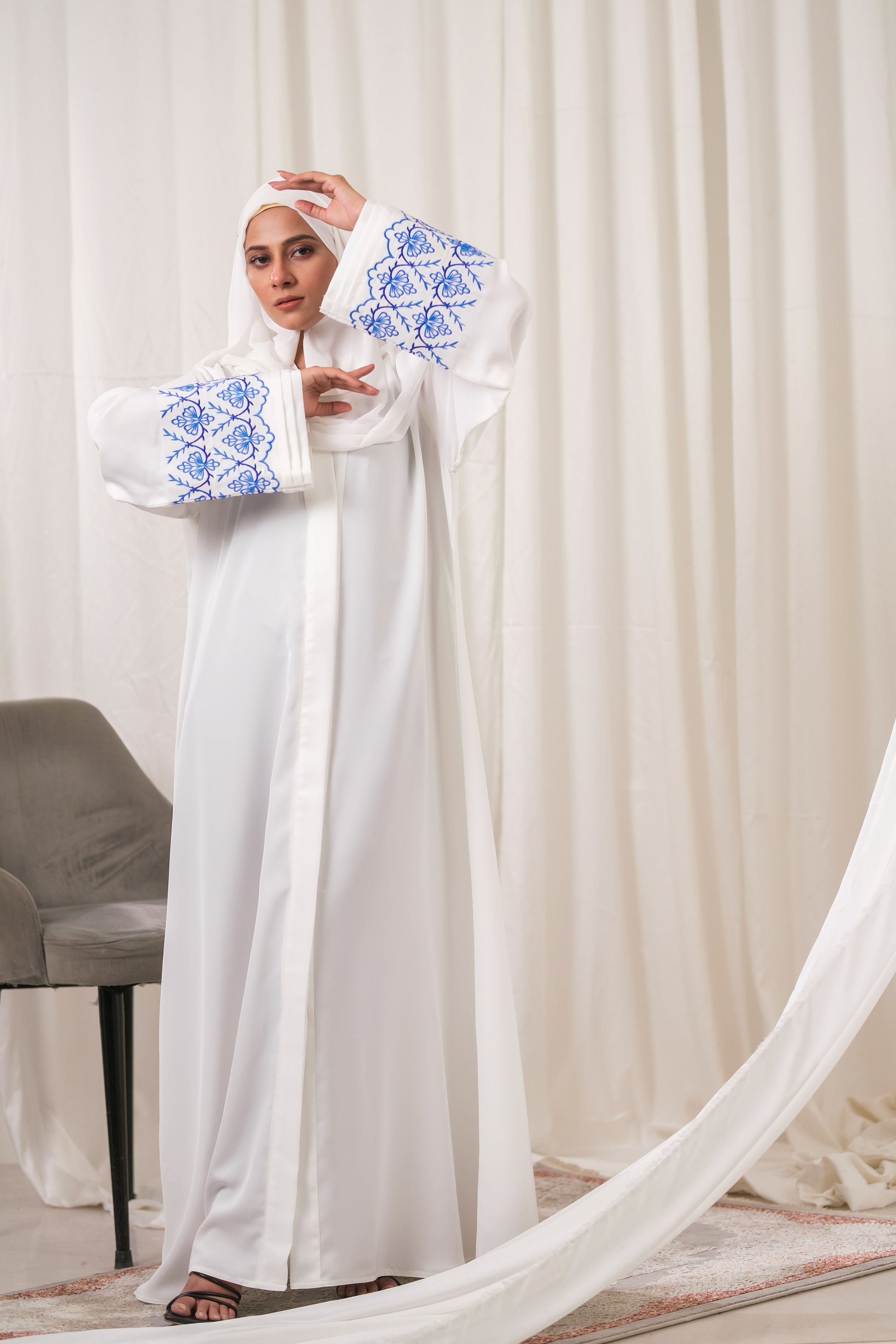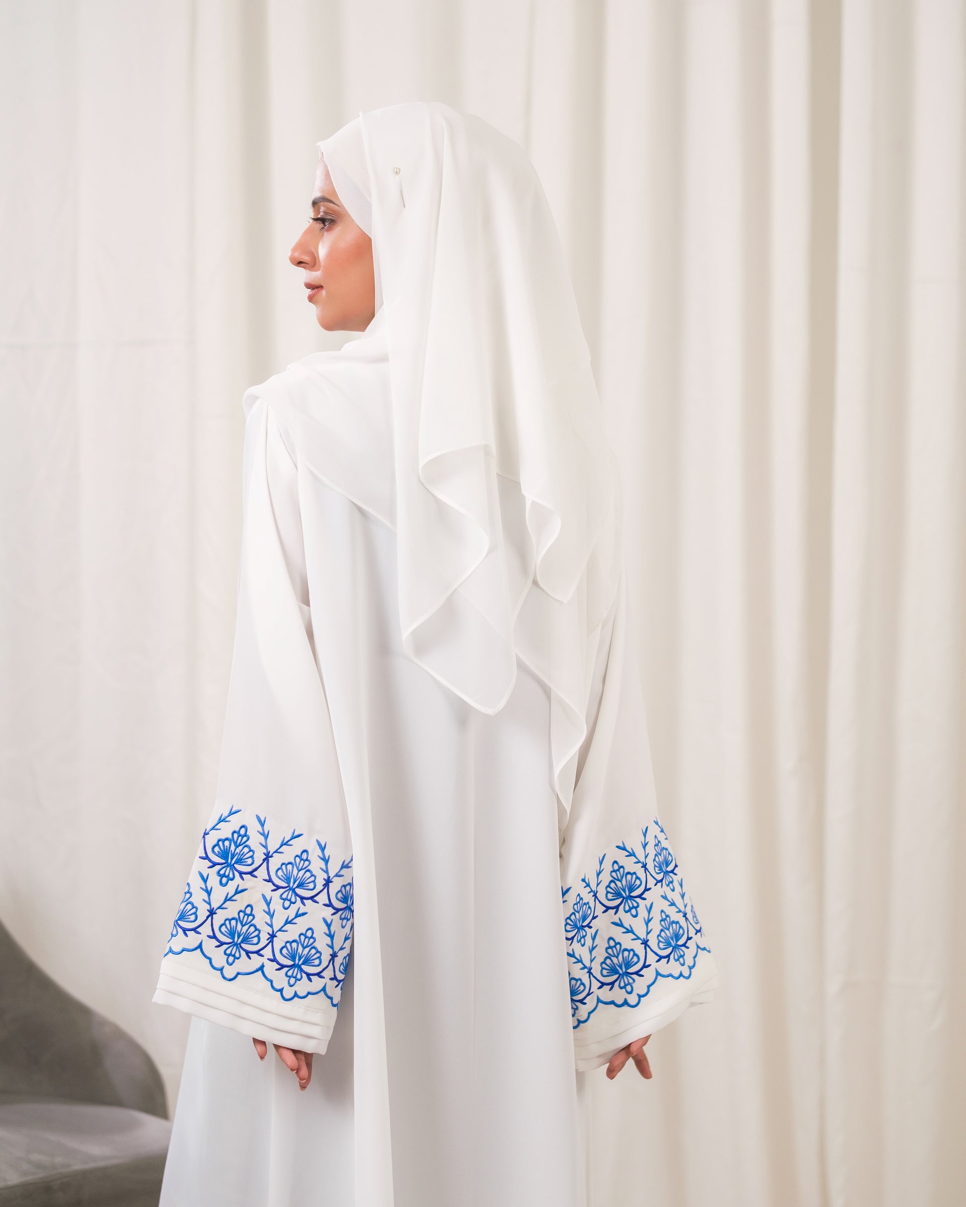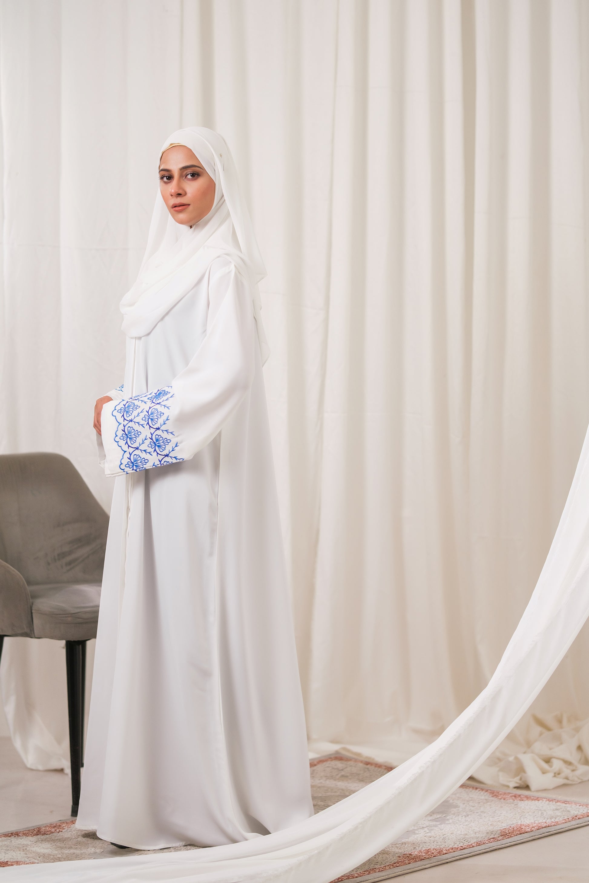 The Isnik Motif Abaya: Pristine White Nidha with High-Contrast Blue Embroidery