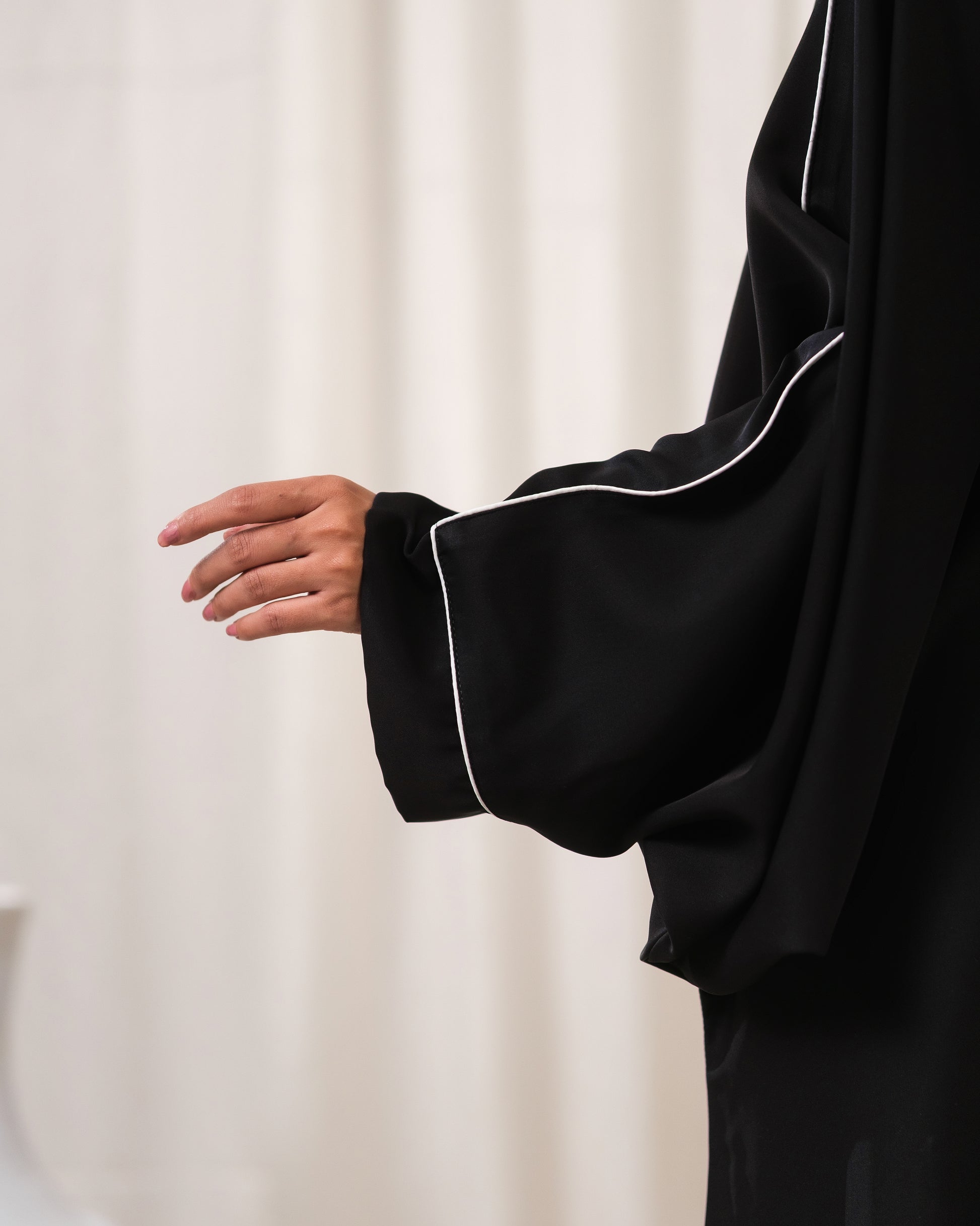 The Meridian Abaya: Dramatic Volume with Central Pleated Design and High-Contrast White Piping