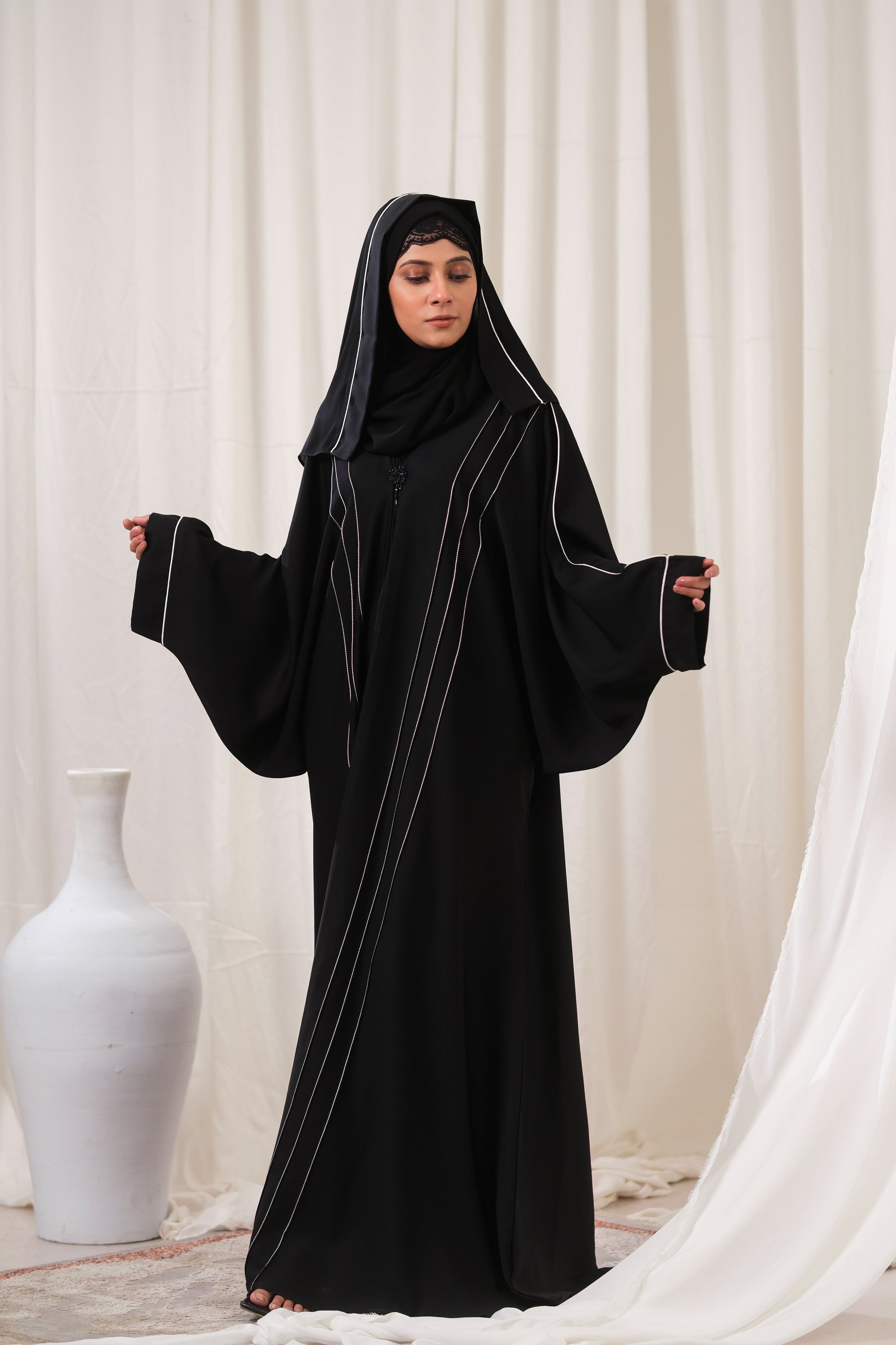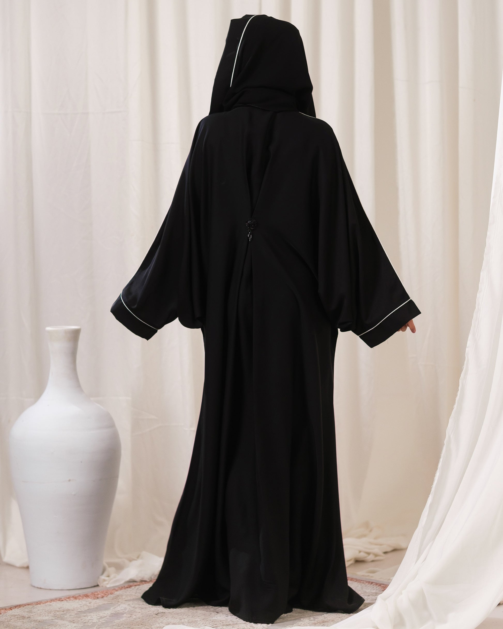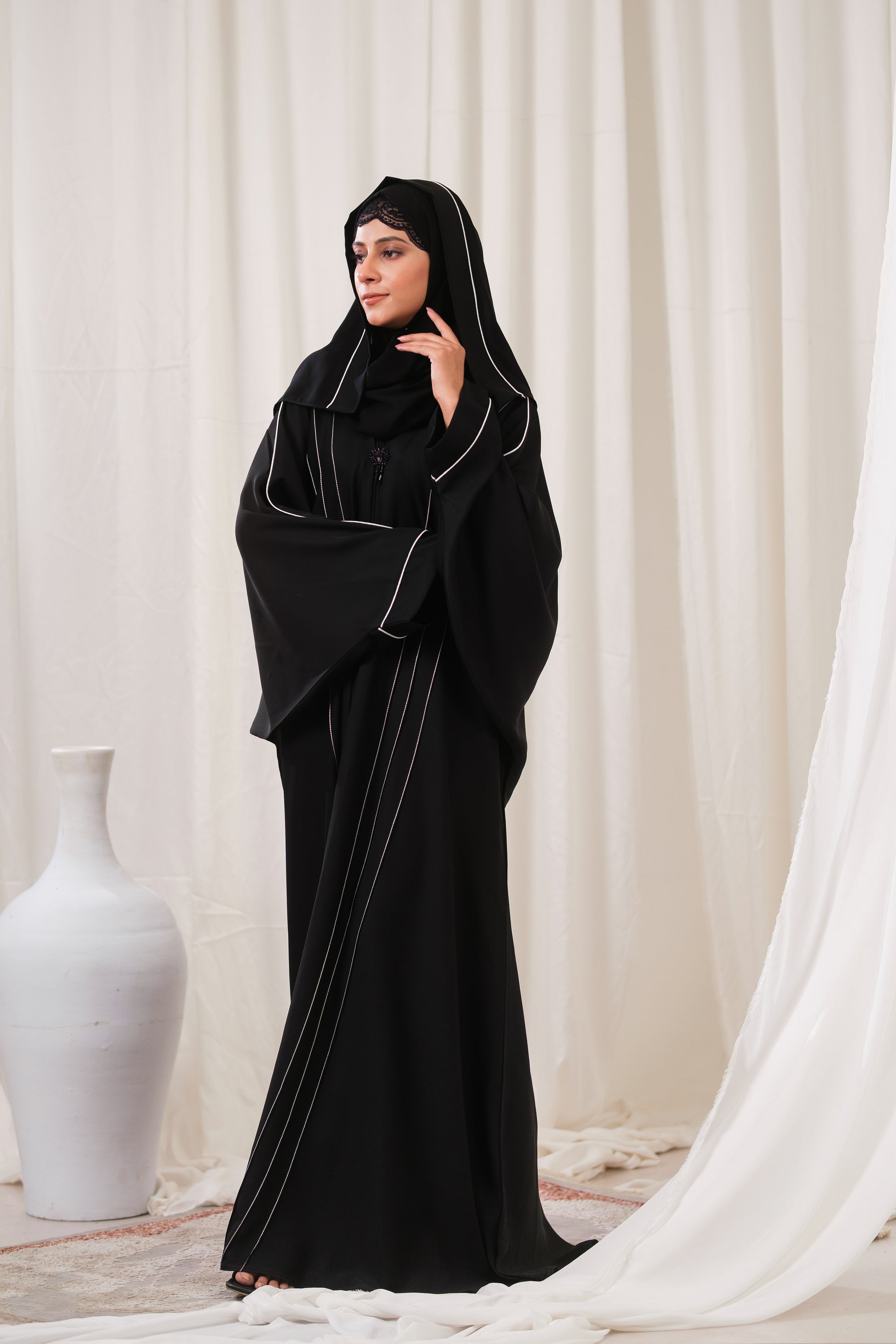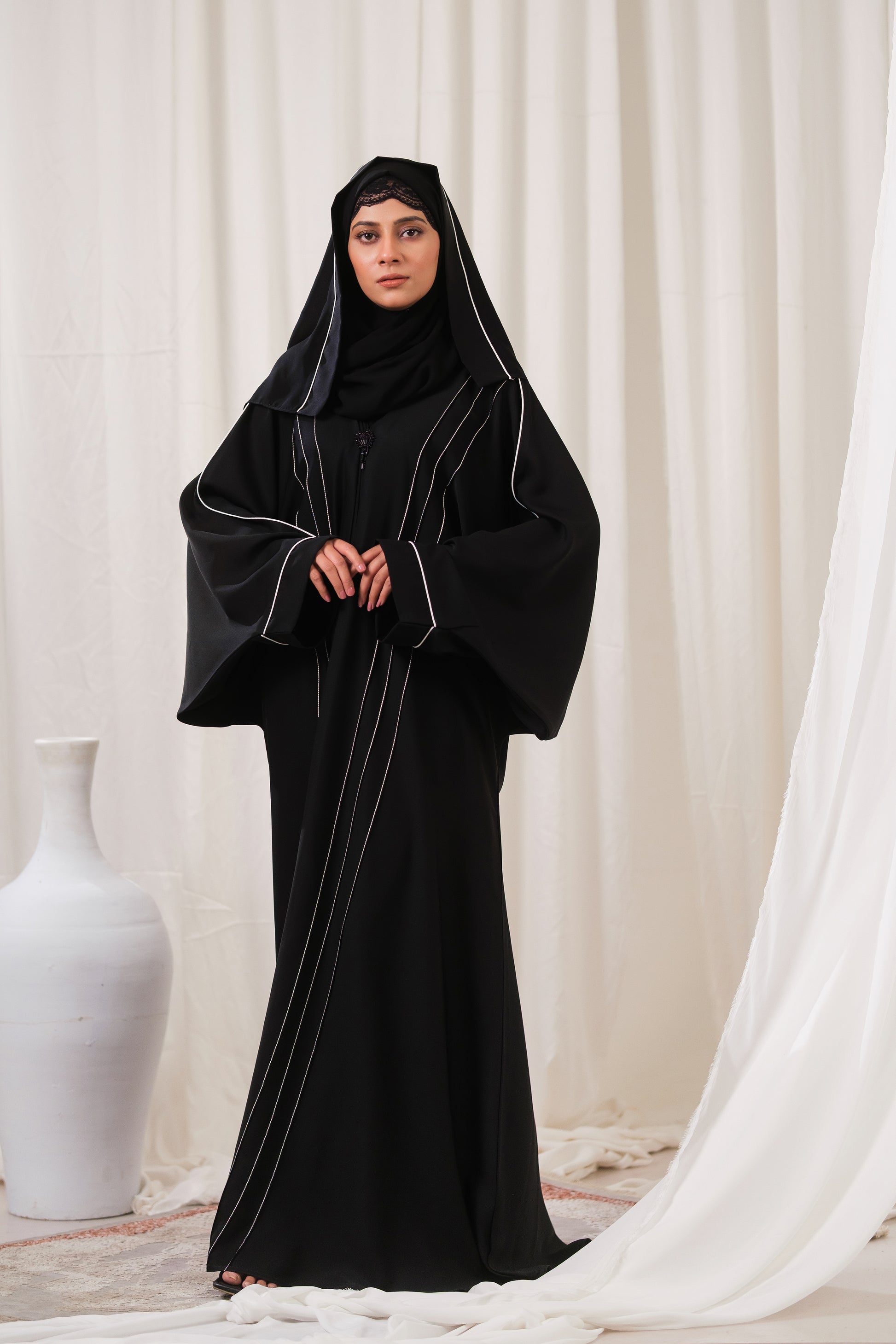 ✓ The Meridian Abaya (Imported Nidha) ✓ Coordinating Black Hood/Headscarf (with White Piping Detail) |