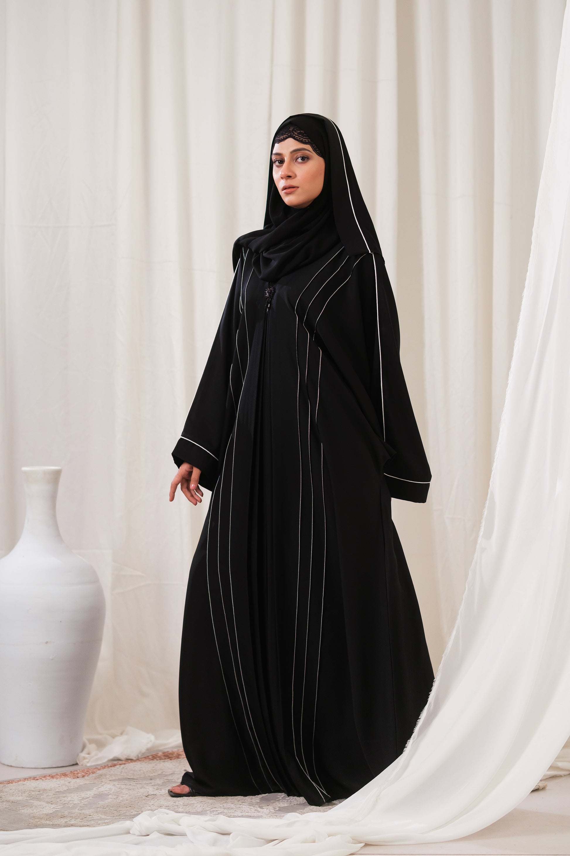 We designed The Meridian Abaya to capture movement, texture, and structured elegance. The premium CTC paneling ensures the curved lines hold their shape, while the central pleating adds an element of classic couture texture. This piece balances the fluid drape of the voluminous Nidha fabric with sharp, linear detailing and rich central texture, using the high-contrast White Piping for a bold, graphic effect.