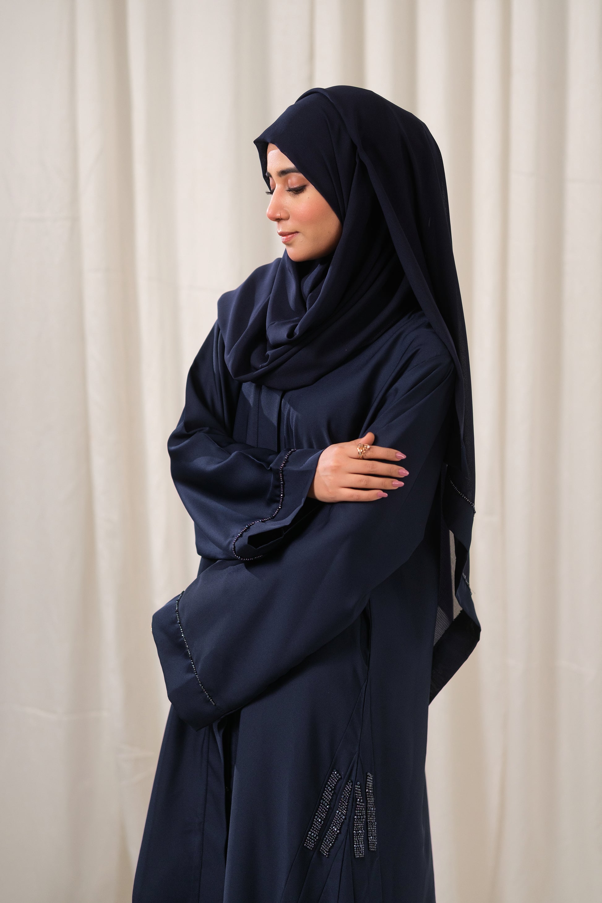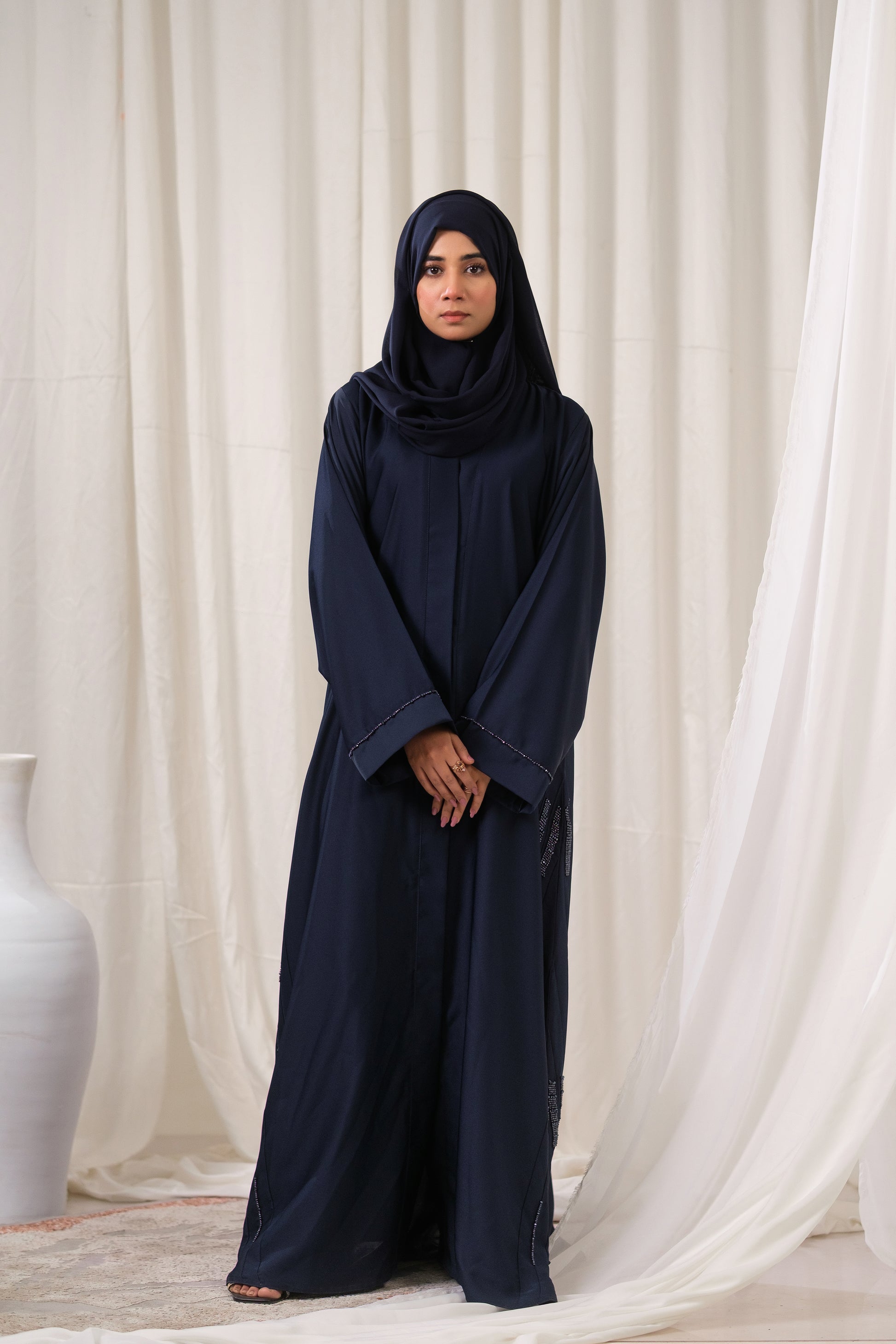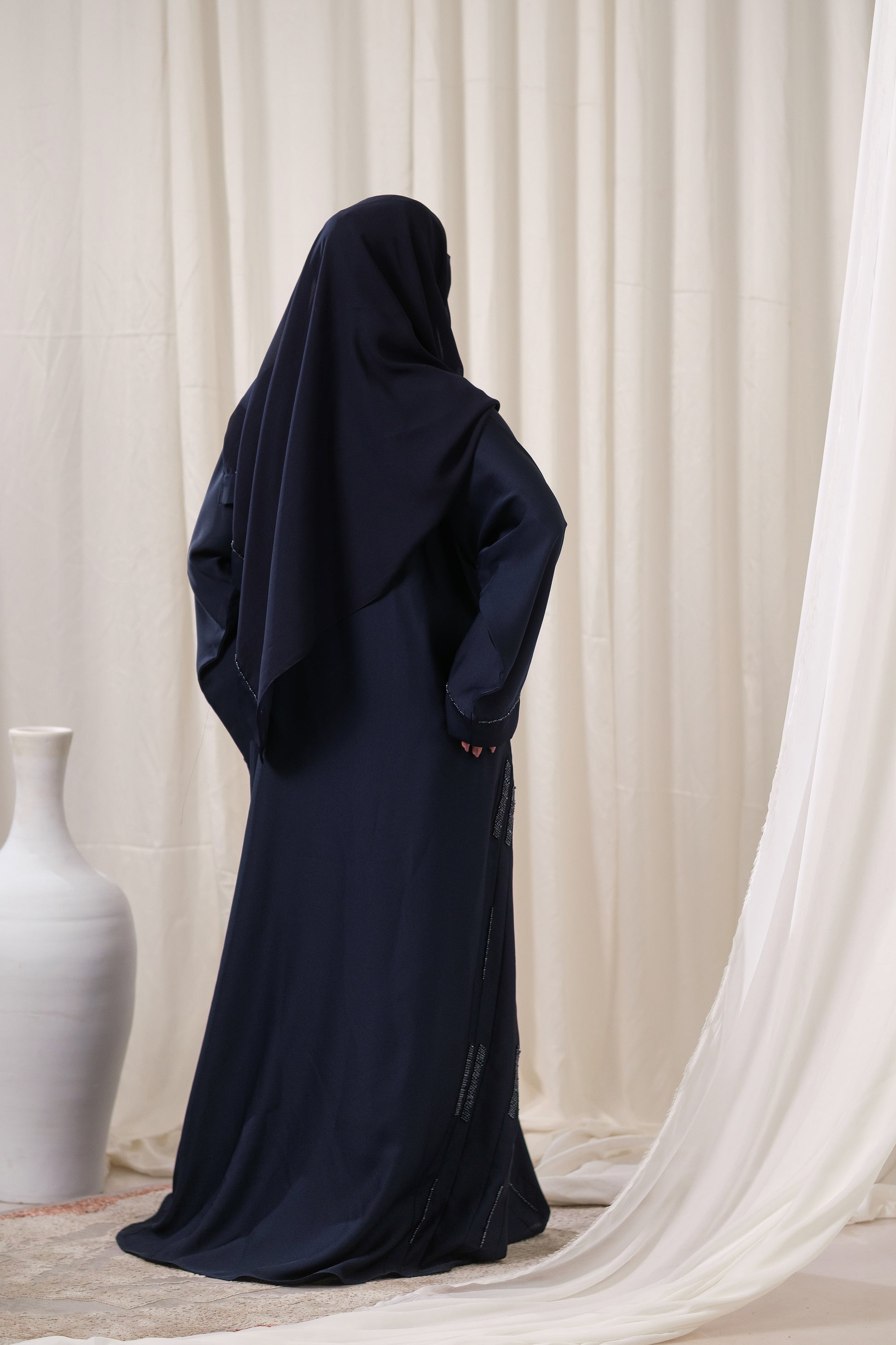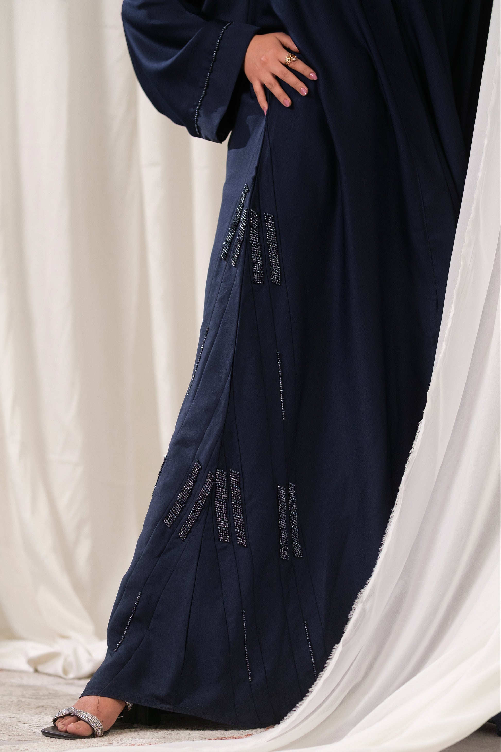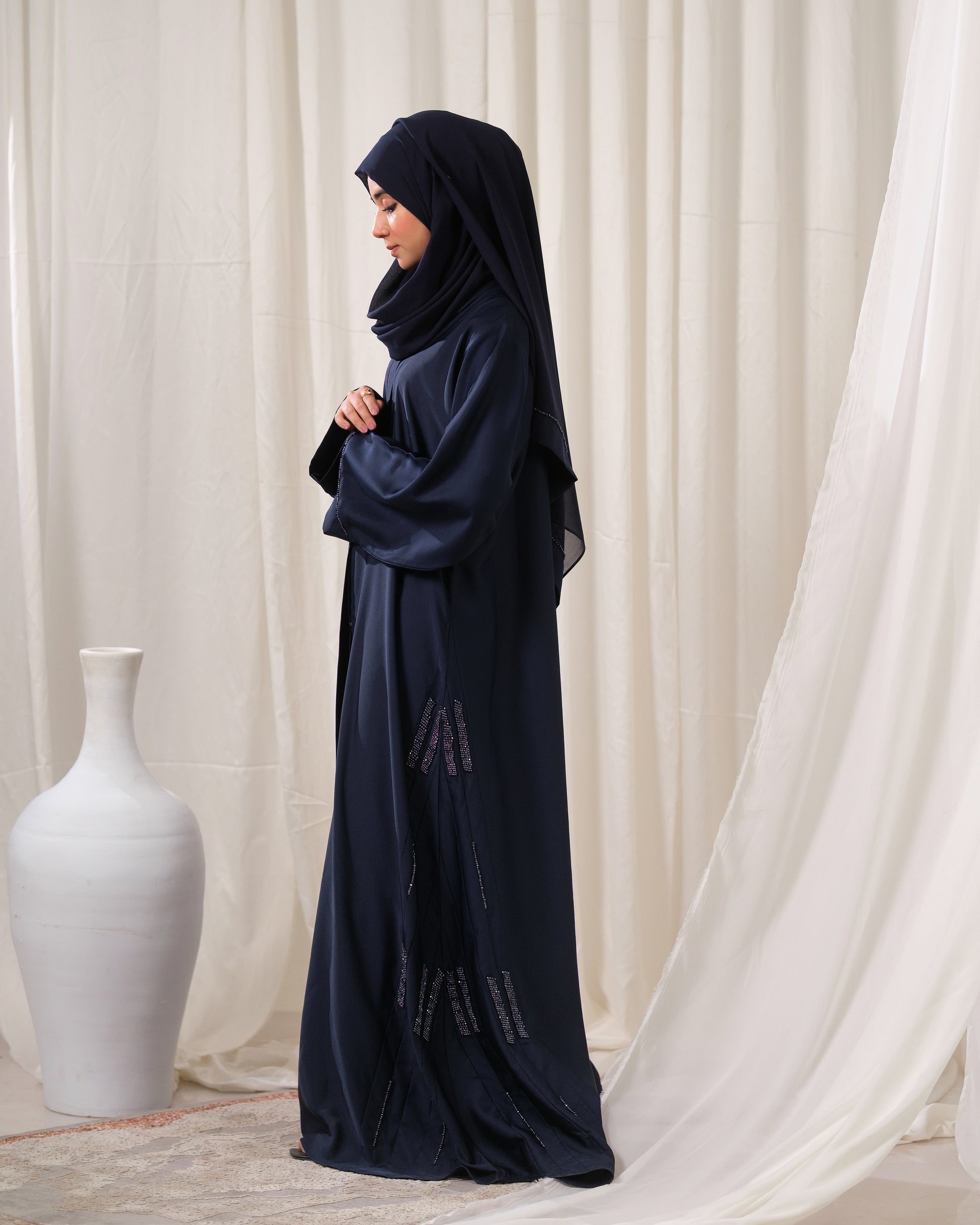 The Midnight Star Abaya, a piece that captures the depth of the night sky and the subtle sparkle of scattered starlight. Crafted from a luxurious, deep navy fabric with an elegant drape, this abaya is elevated by delicate, textured metallic detailing that flows vertically along the side, offering sophisticated glamour without overt shine.