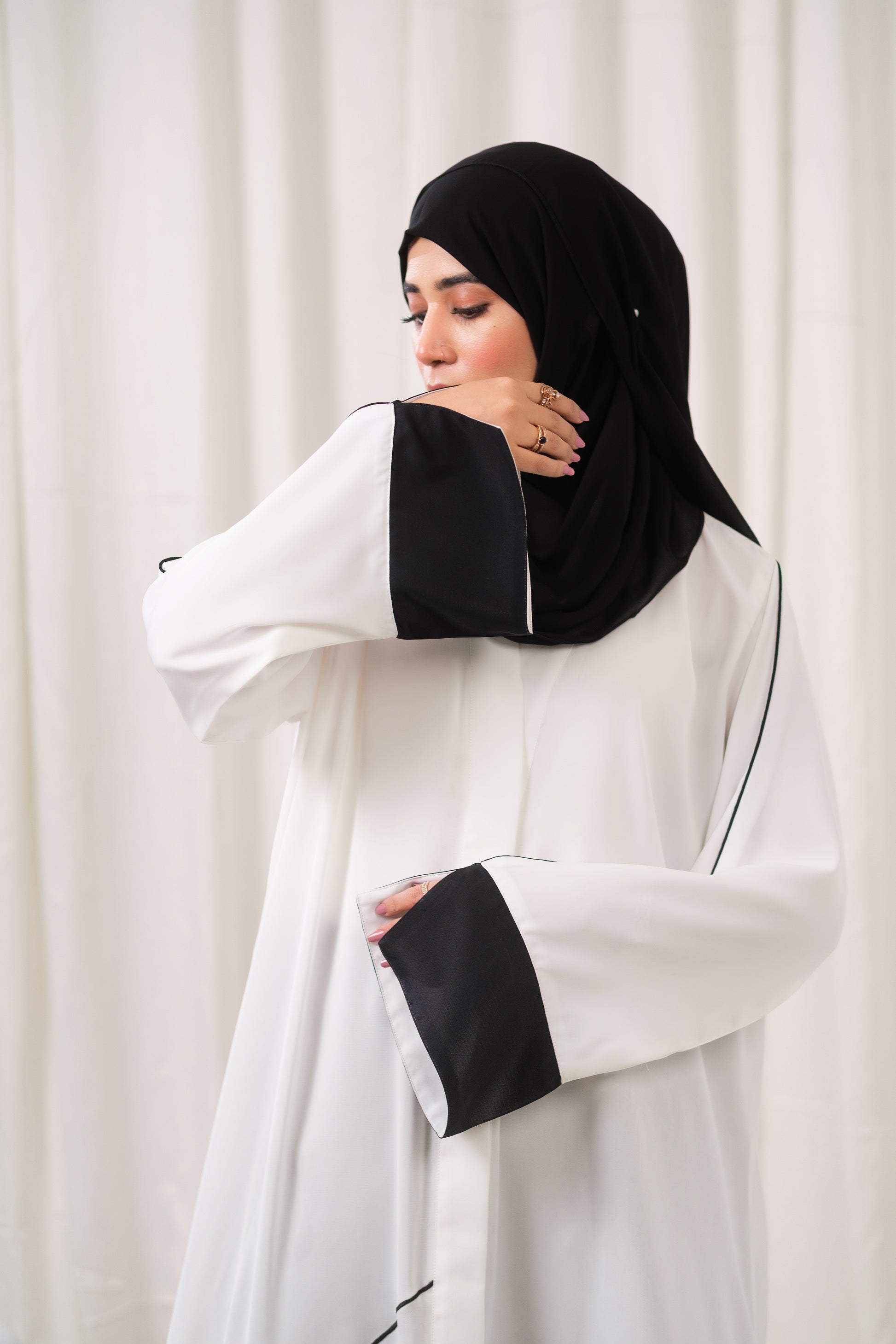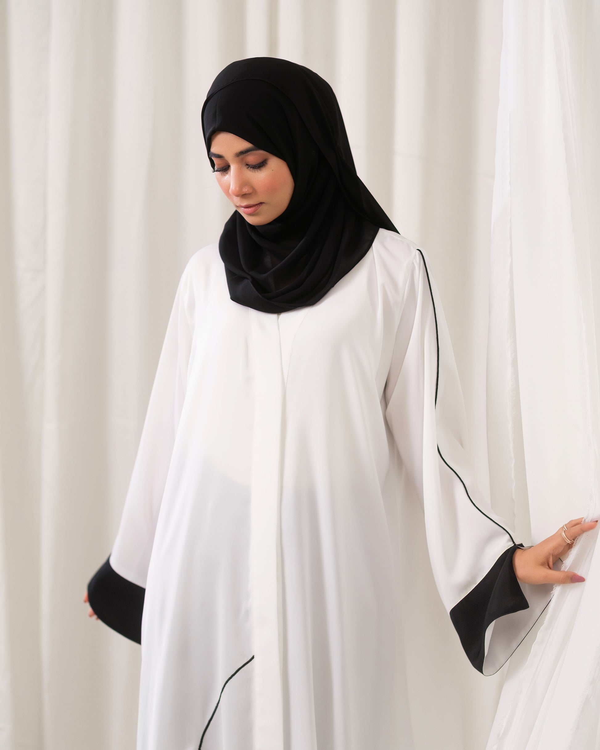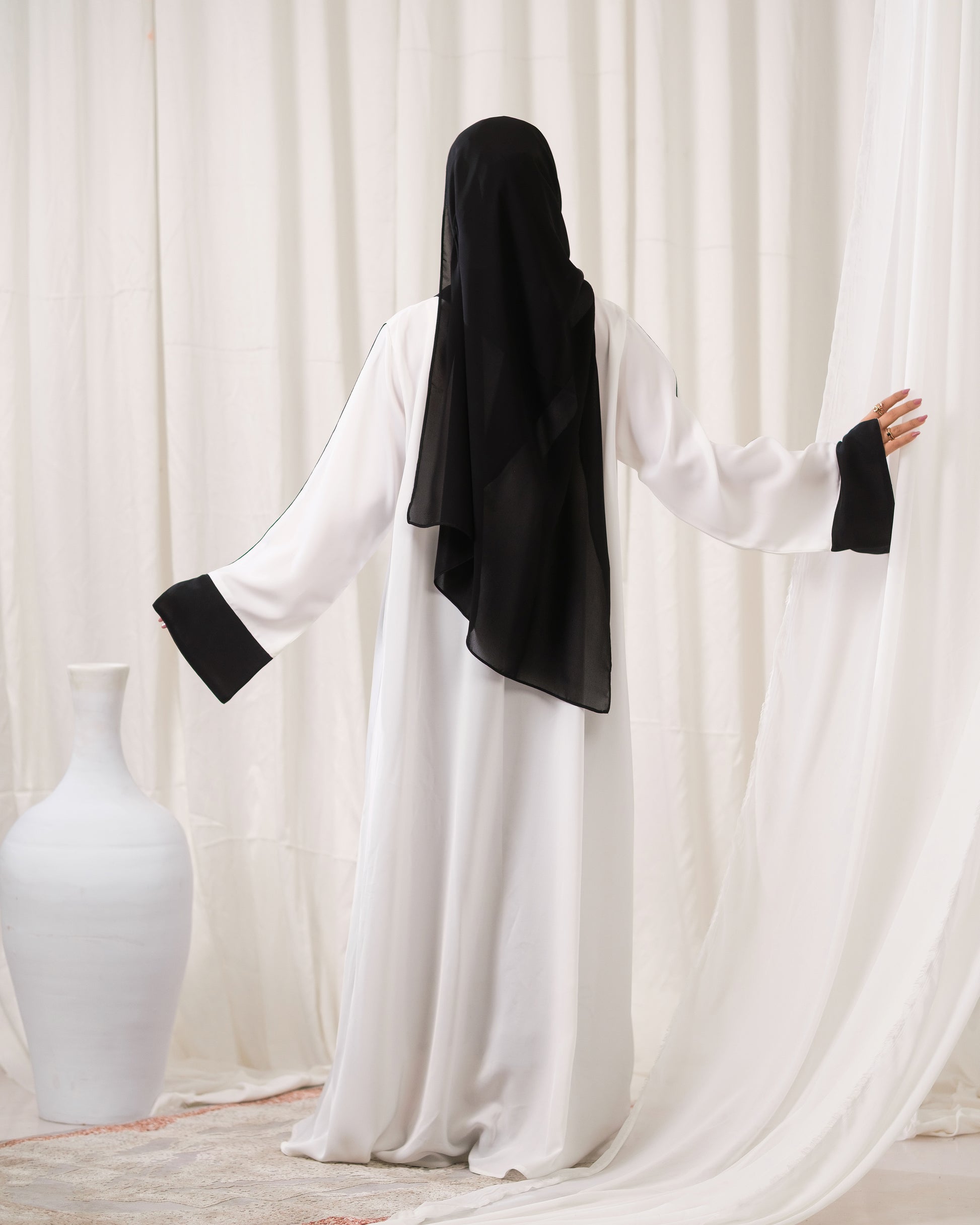 ✓ The Modern Bloom Abaya (White Imported Nidha with Black Trim) ✓ Matching Premium Black Chiffon Hijab |