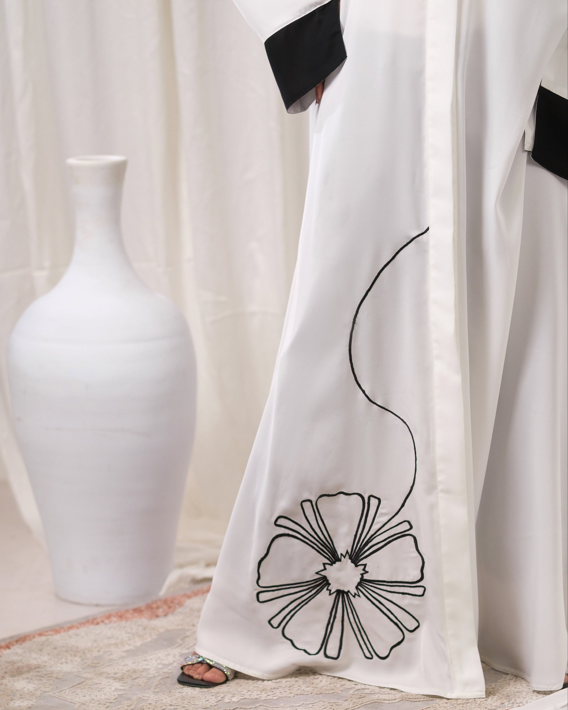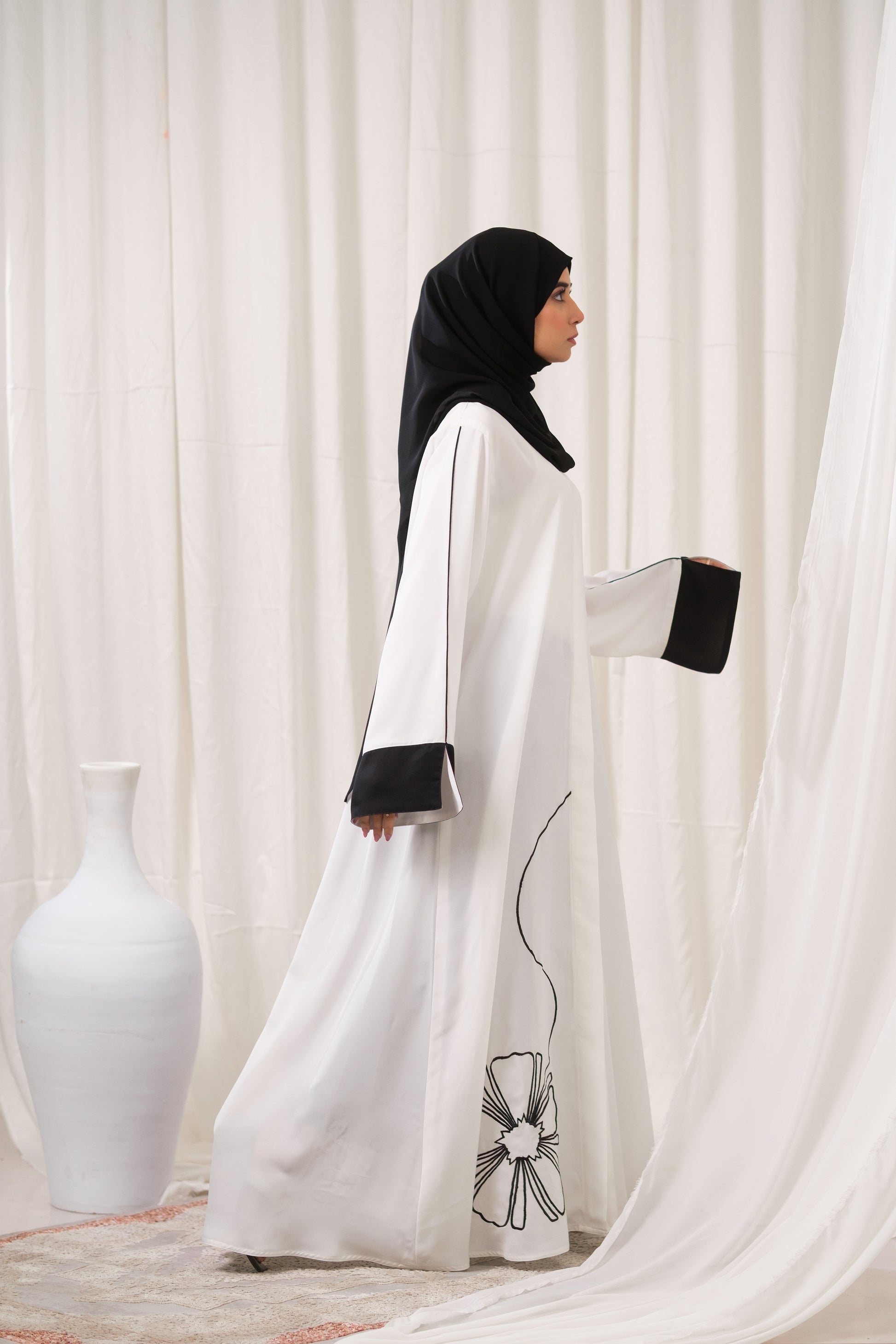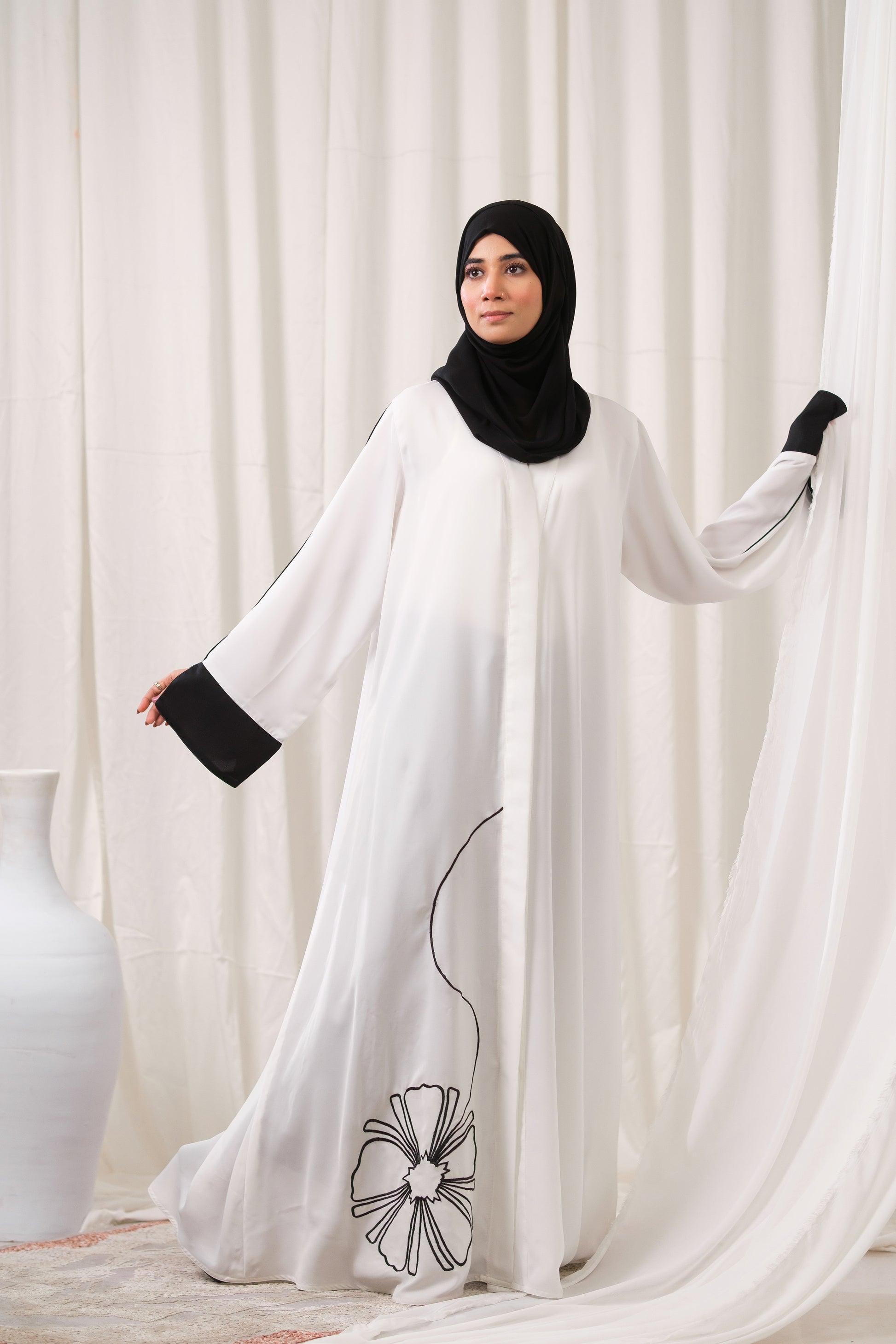 ✓ The Modern Bloom Abaya (White Imported Nidha with Black Trim) ✓ Matching Premium Black Chiffon Hijab |