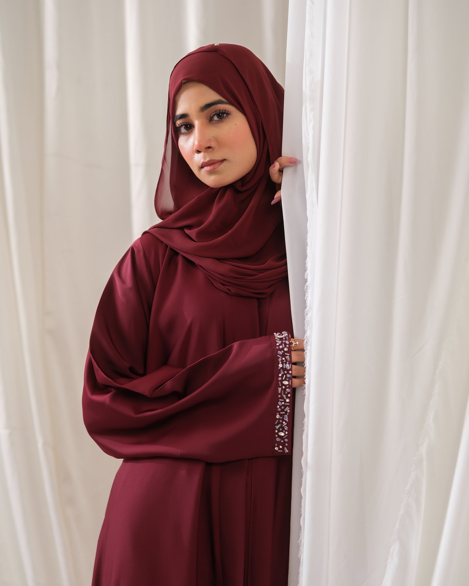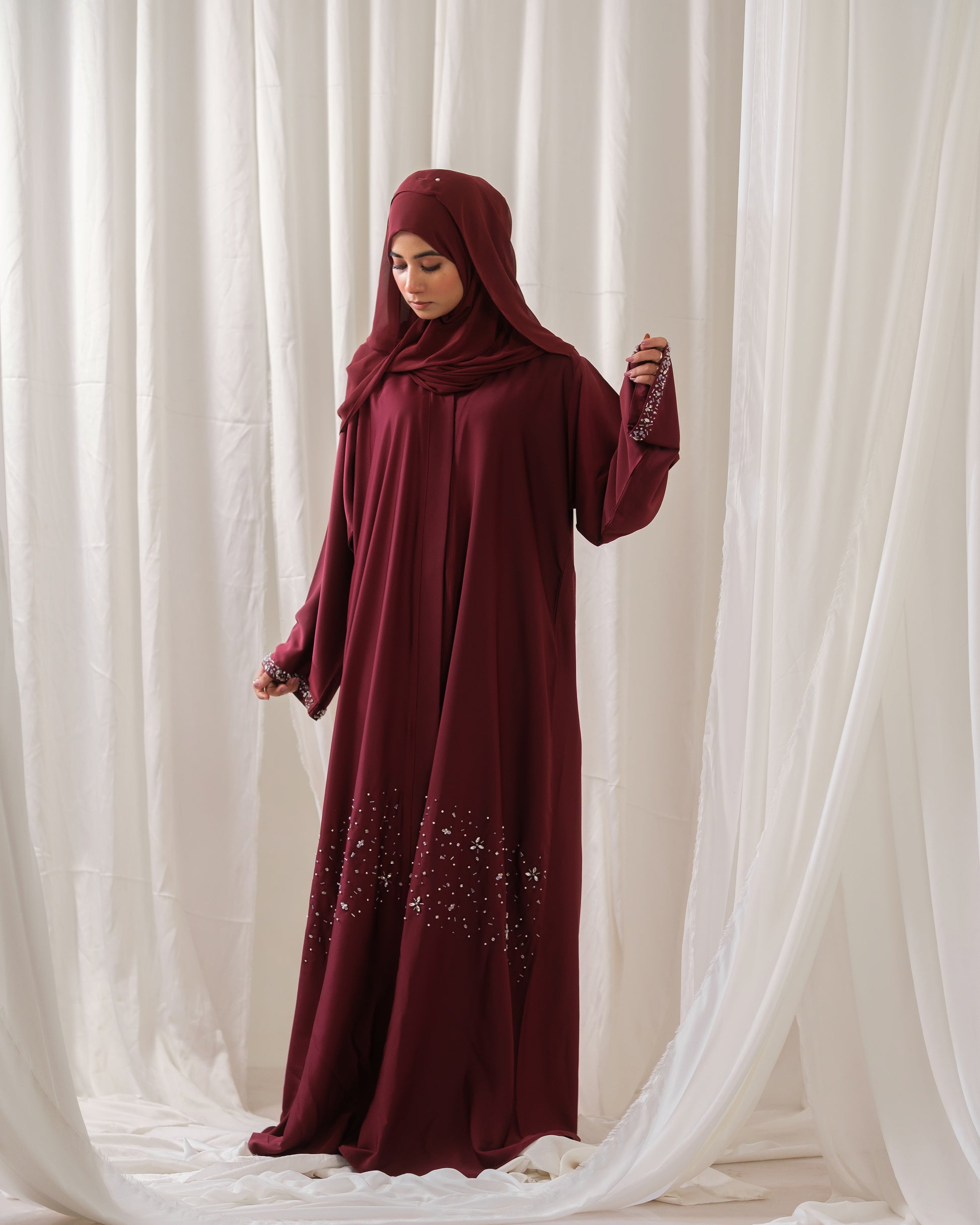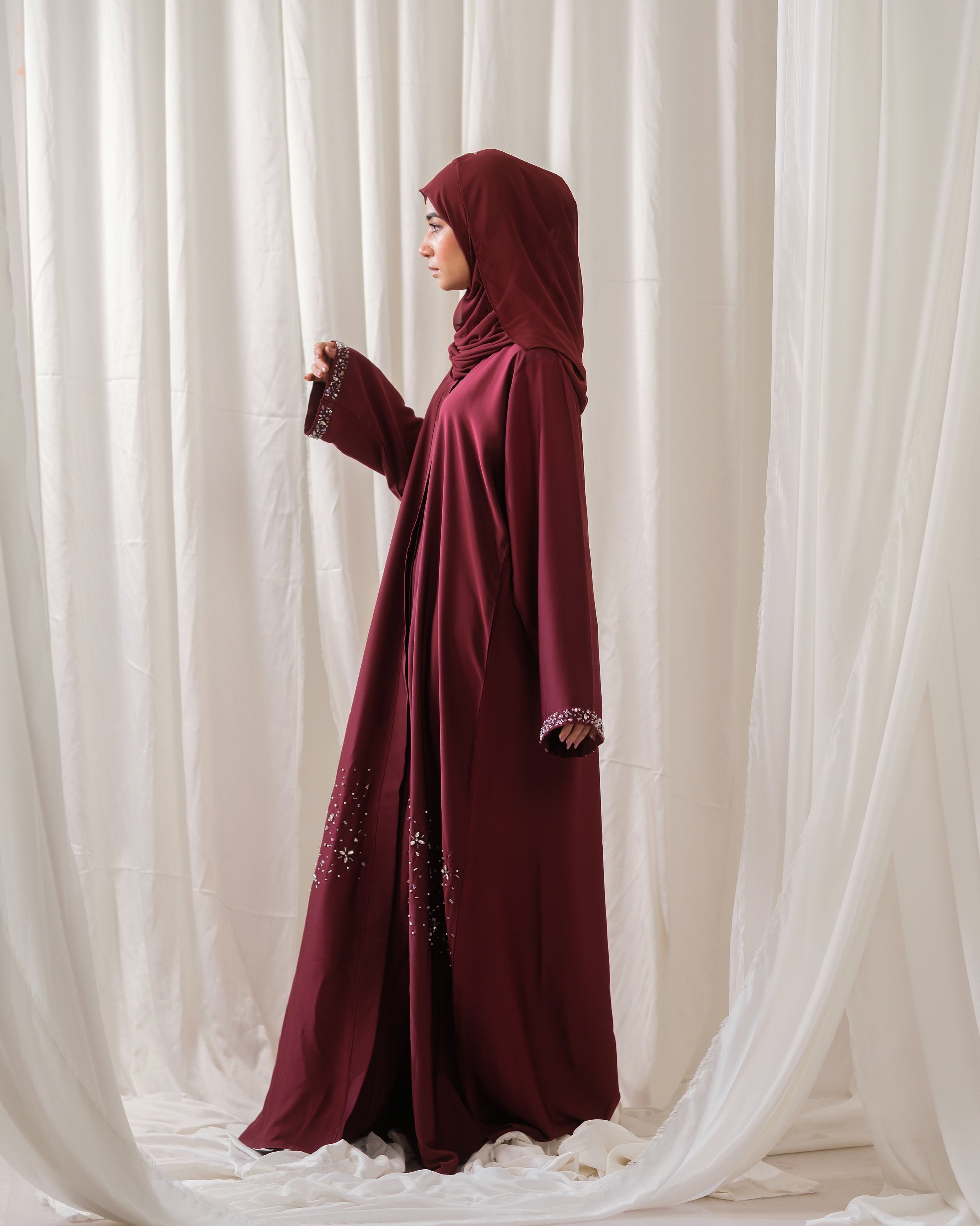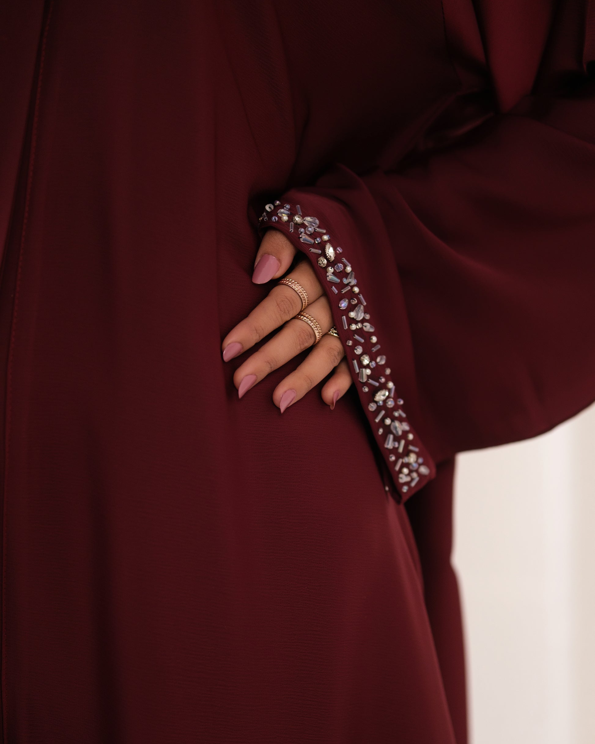 The Ruby Vine Abaya: Hand-Finished Elegance in Jewel-Toned Maroon