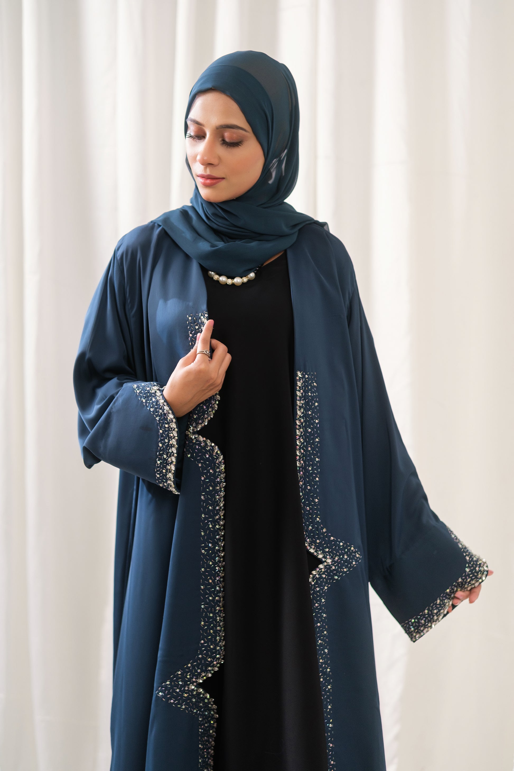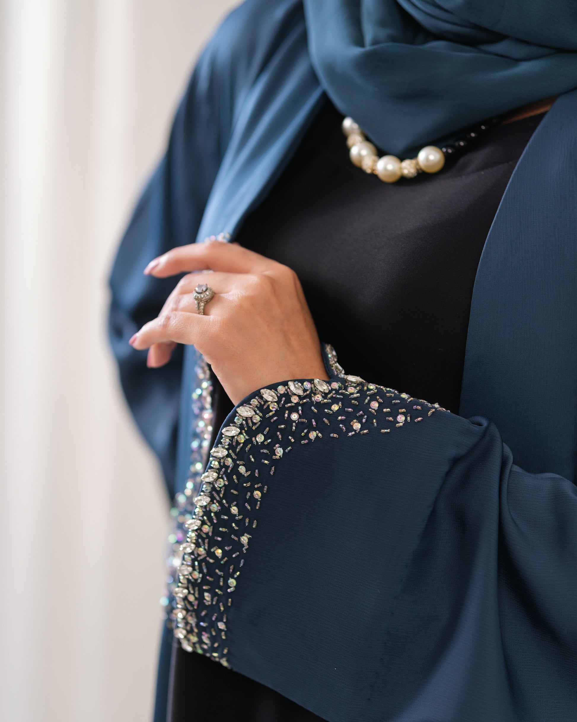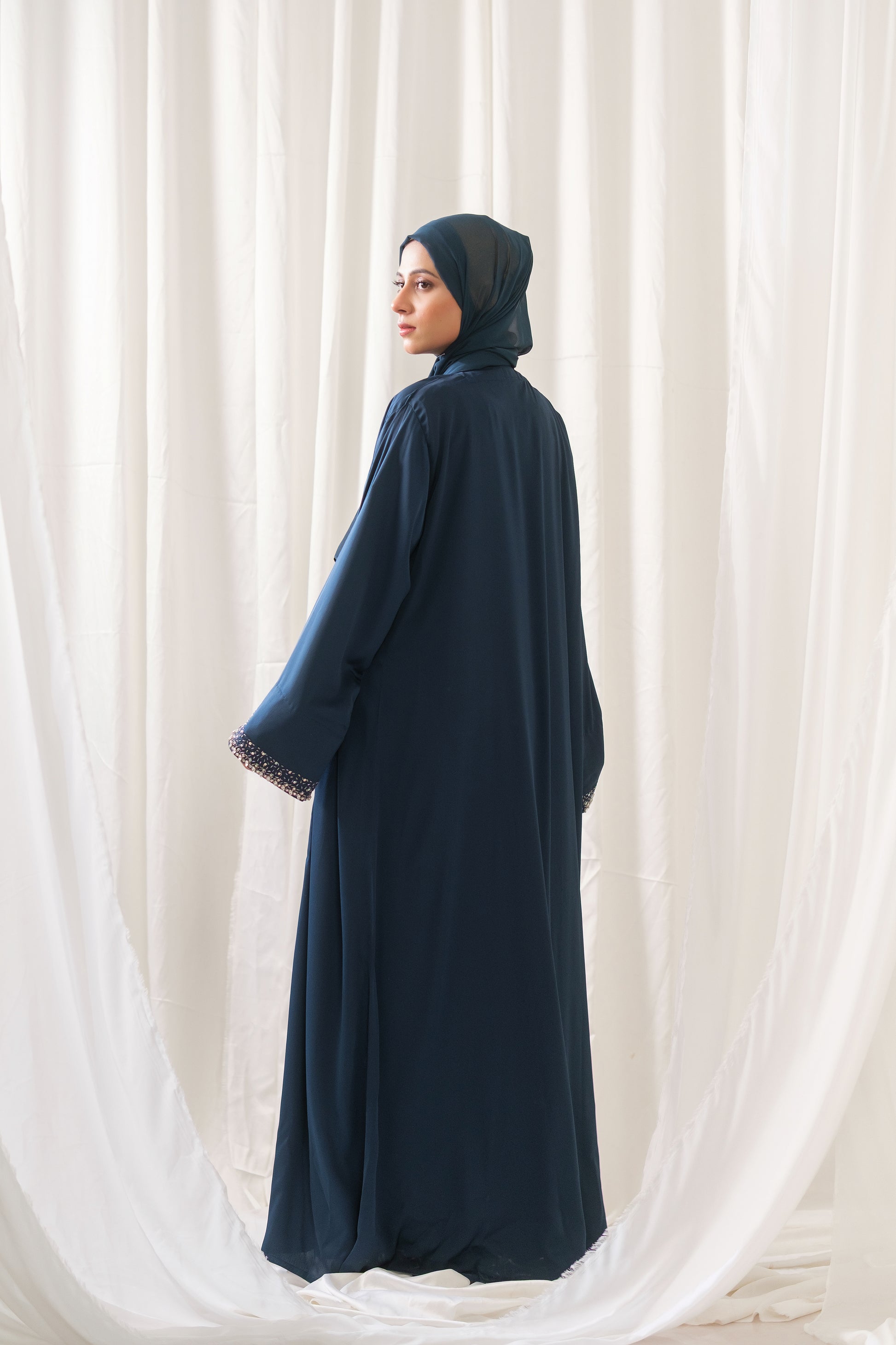 The Lumina Abaya: Deep Blue with Dazzling Crystal Beaded Front Trail and Cuffs