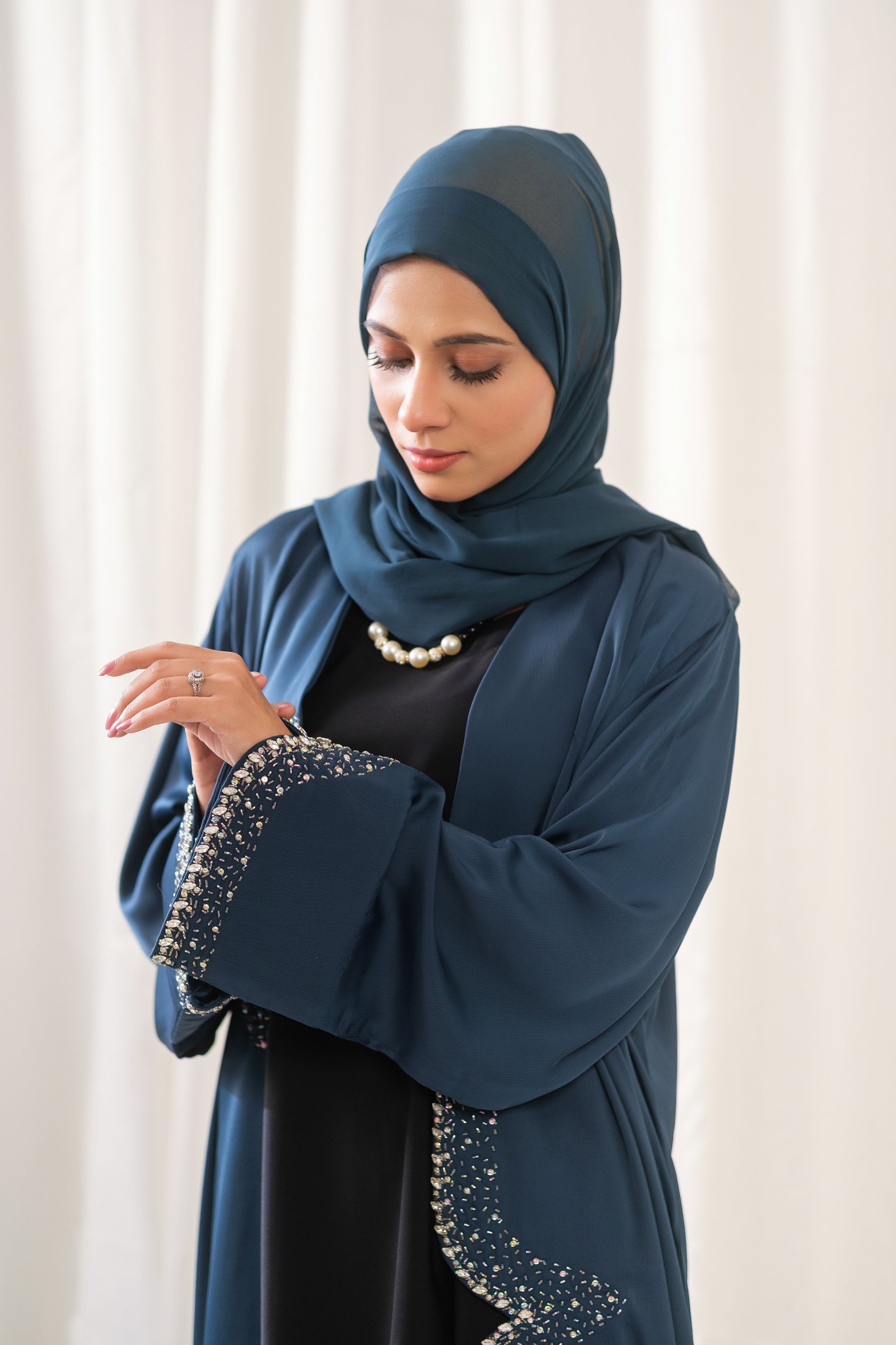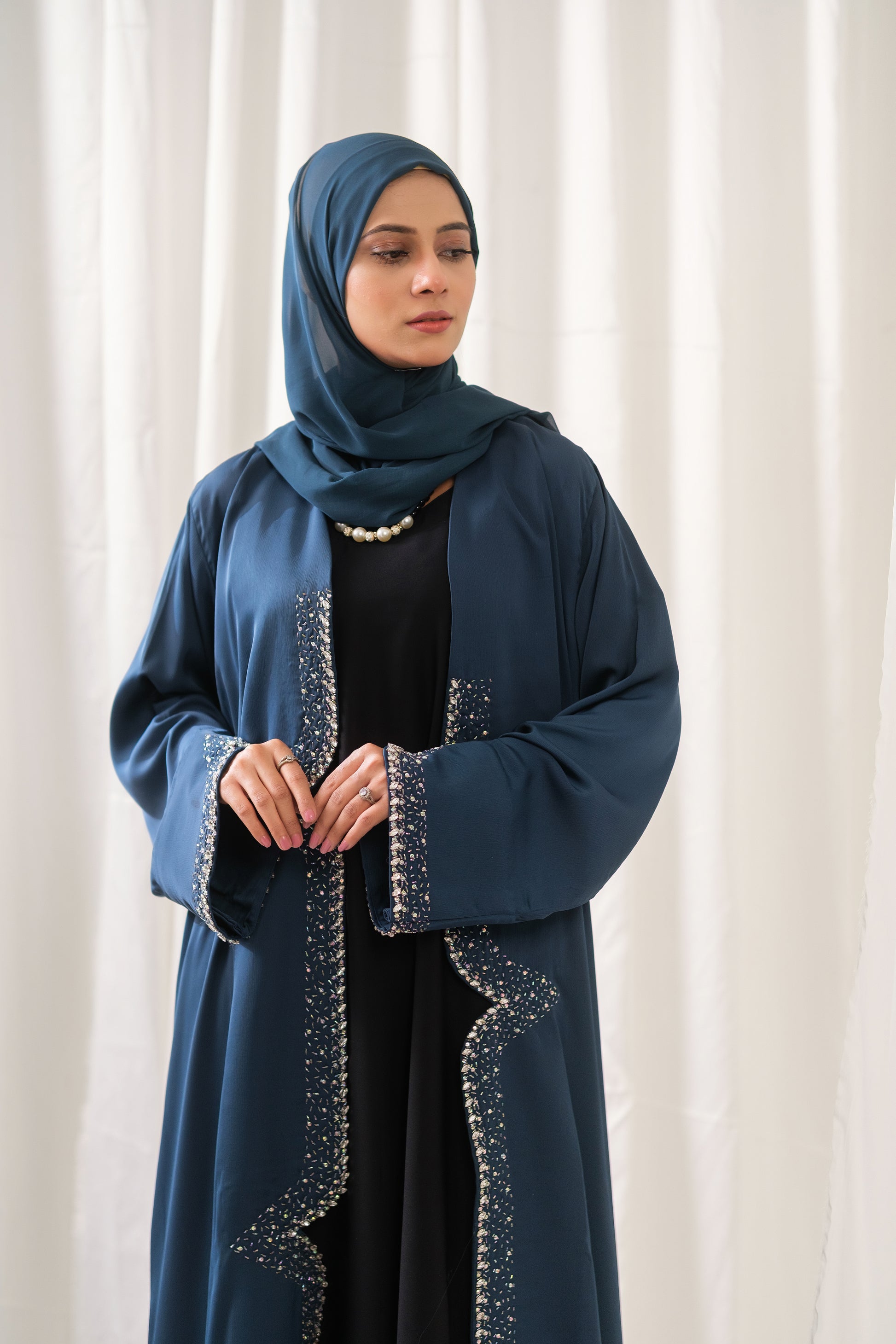 Complete Luxury Set: Includes the heavily embellished abaya, the matching Blue Chiffon Hijab, and a luxurious Black Nidha Inner Dress.