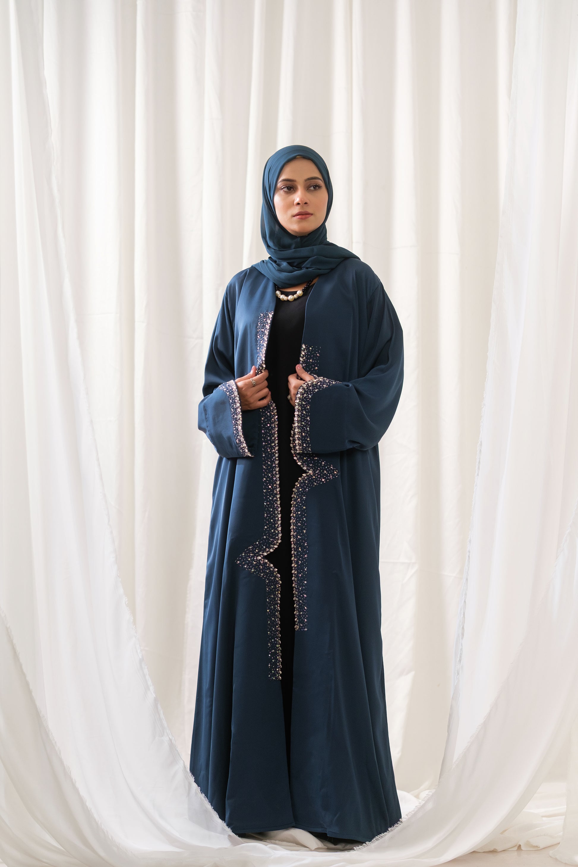 The Lumina Abaya, the ultimate expression of sparkling luxury and our most expensive piece. Crafted from flowing Imported Nidha Fabric in a rich, deep blue hue, this abaya is defined by an exquisite, continuous trail of silver and opalescent crystals and seed beads that flow down the entire length of the front panels. This dramatic front work is perfectly mirrored and concentrated on the cuffs, delivering an entire look of unmatched opulence, complemented by the included black Nidha inner.