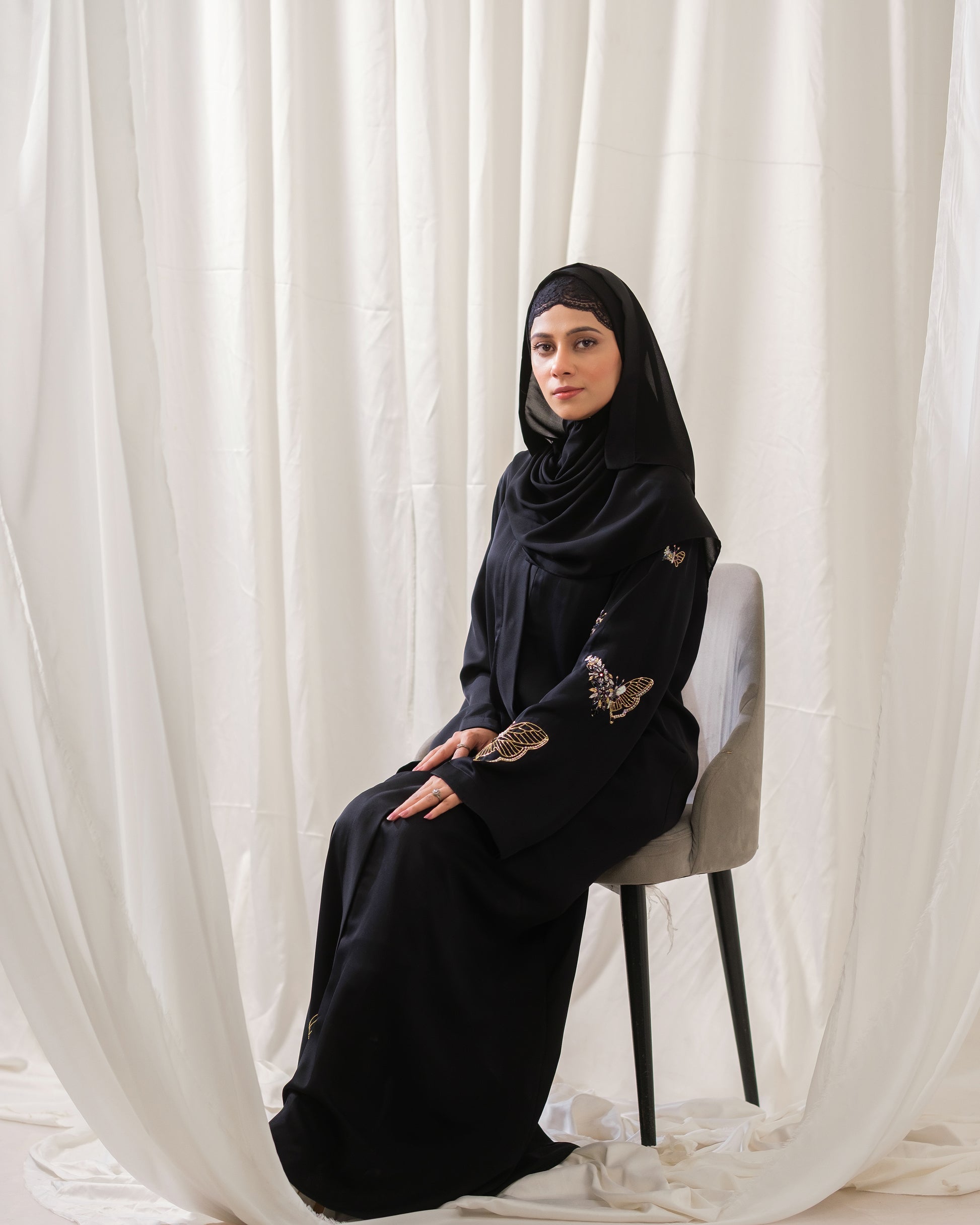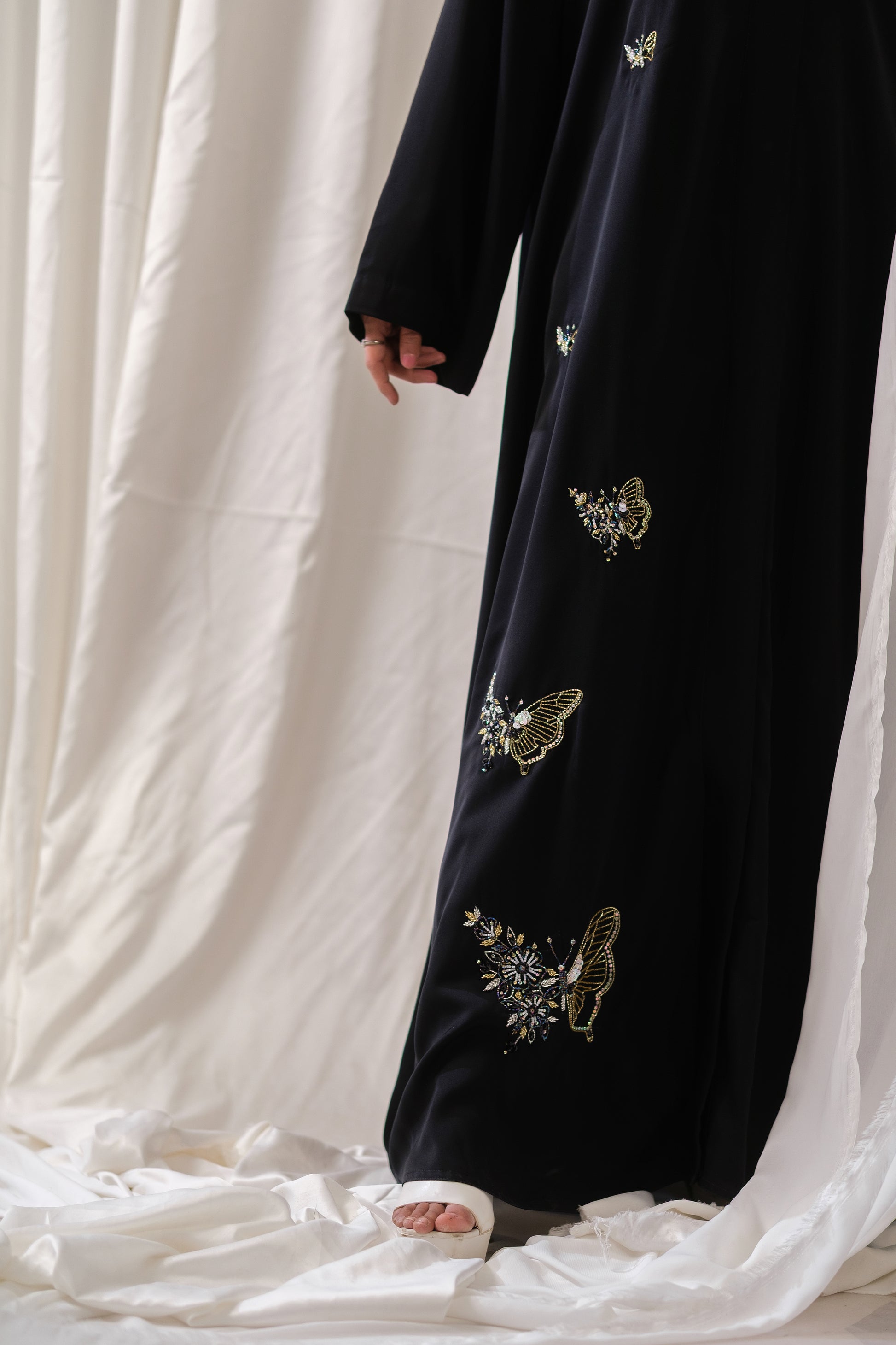 Introducing The Monarch Abaya, a classic black piece elevated by whimsical, couture detailing. Crafted from luxurious Nidha Fabric, this abaya features a series of delicate butterfly motifs created using shimmering gold, silver, and multi-colored beads. These handcrafted butterflies appear to flutter vertically down the entire front panel and dramatically up the entire length of one sleeve, adding an enchanting element of movement and artistry to the traditional black silhouette.