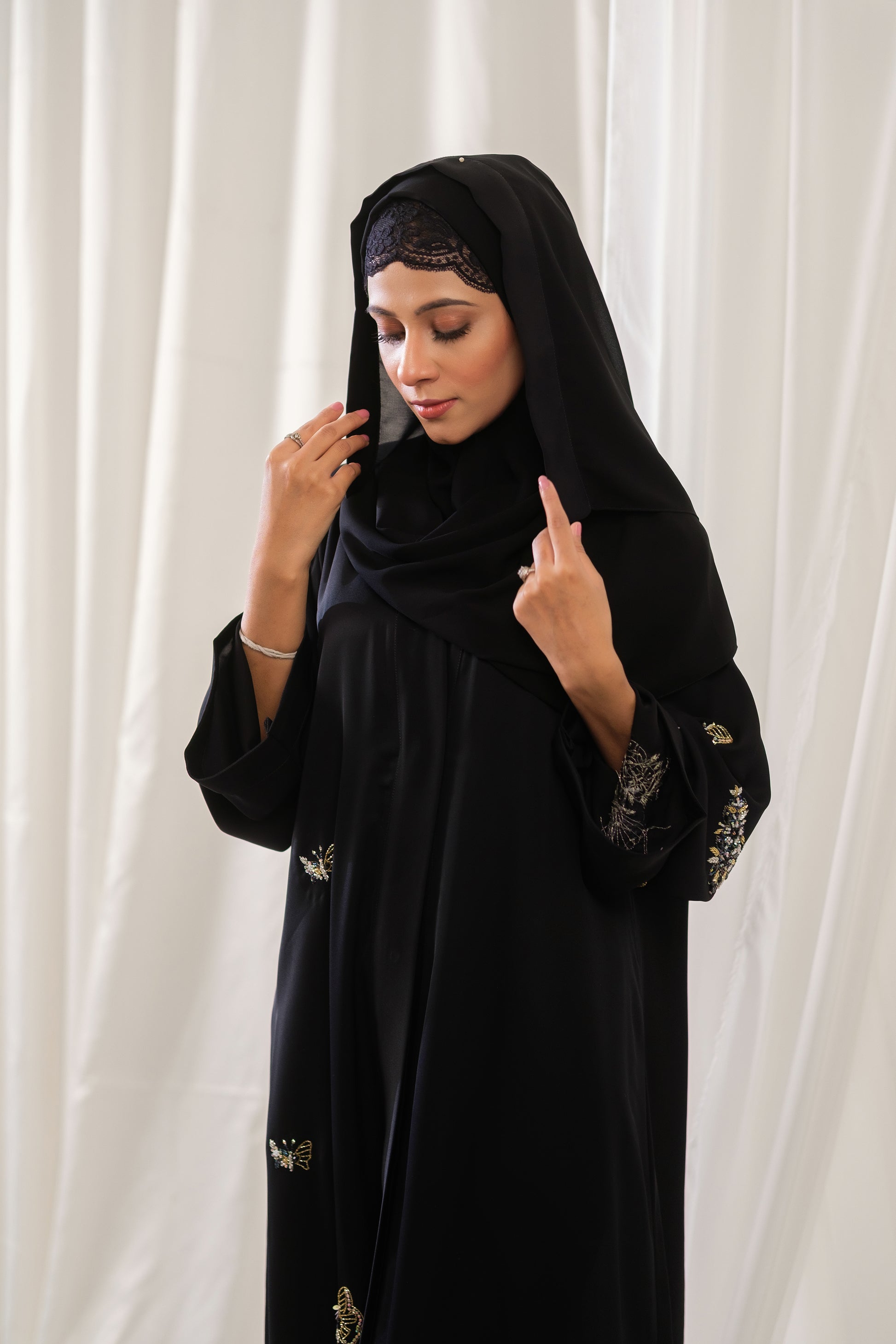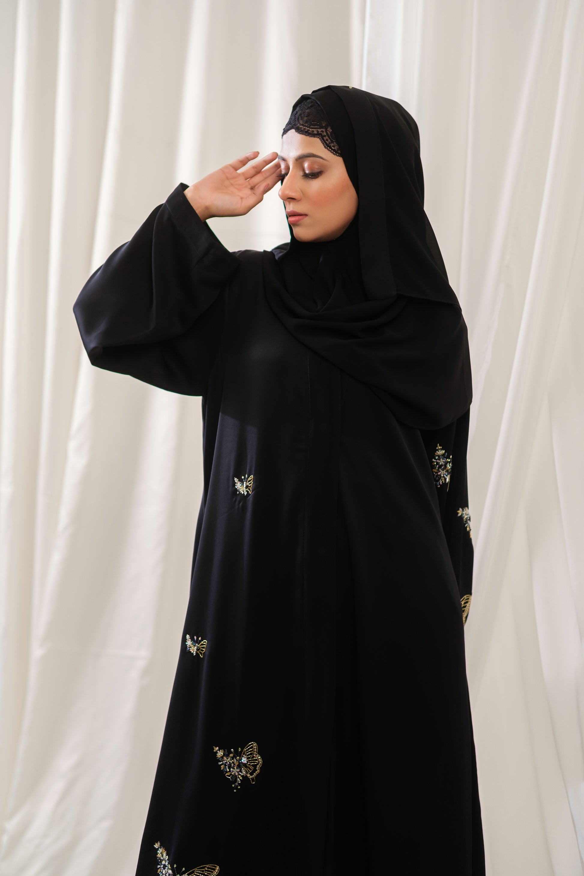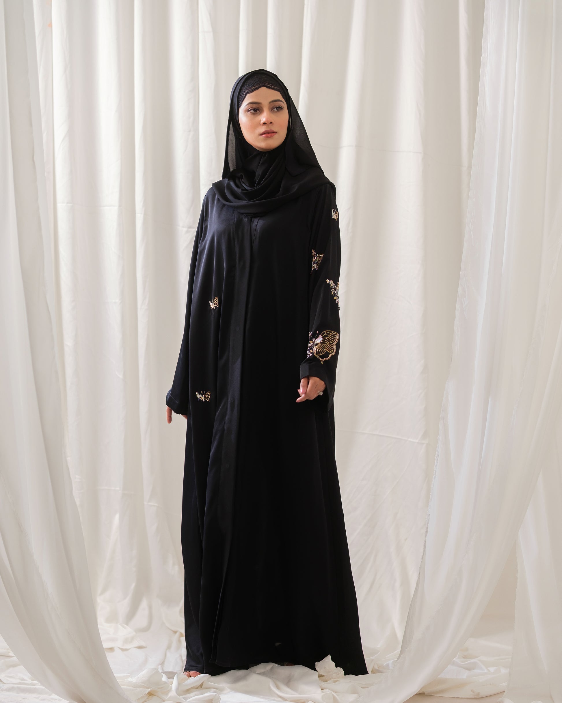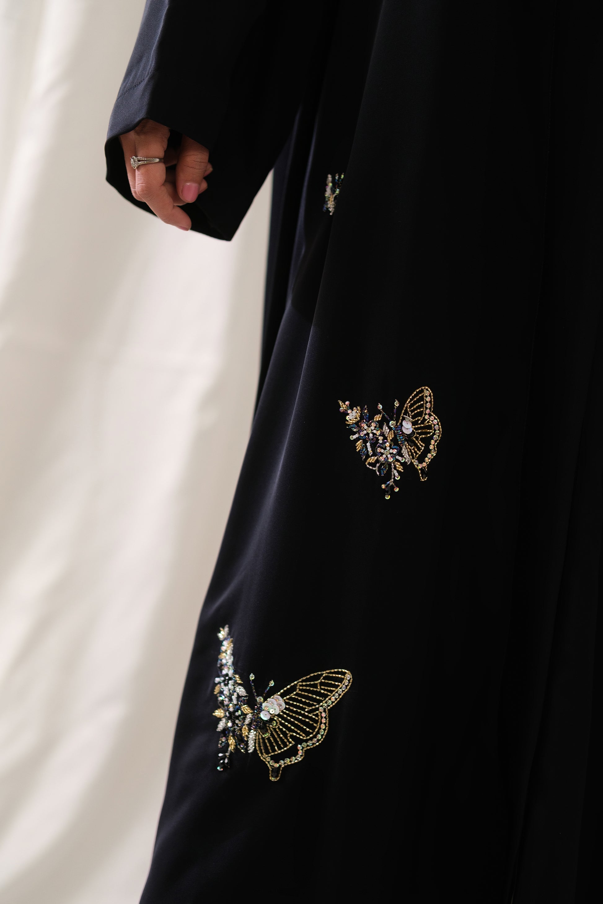 The Monarch Abaya: Classic Black with Dazzling Beaded Butterfly Trail on Front and One Sleeve.